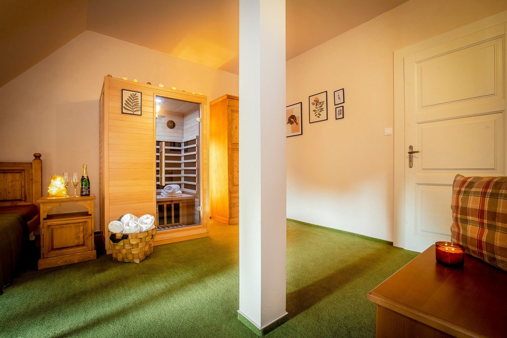 Ubytování ve stínu stoletých dubů, Infrasauna, restaurace Osvěžovna uprostřed lesů Černické obory (místní dodavatelé - lokální pražírny Garage Cofee nebo pivo z nedalekého pivovaru Obora).