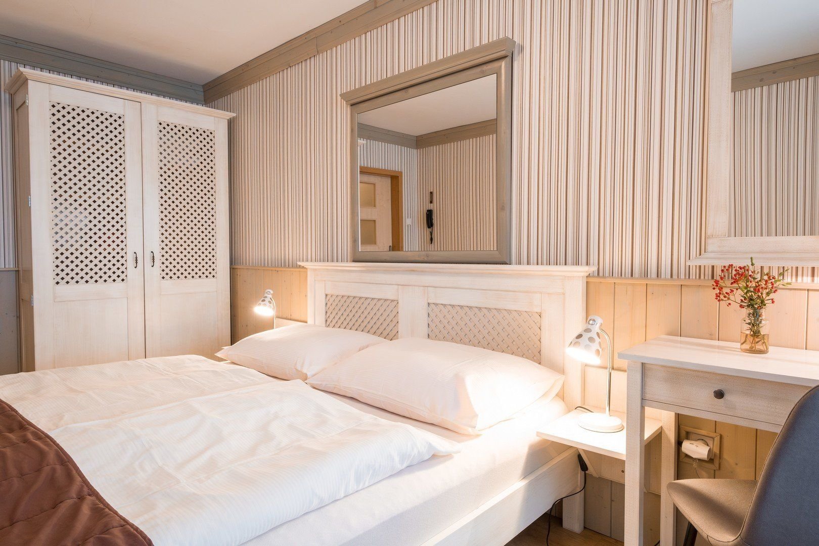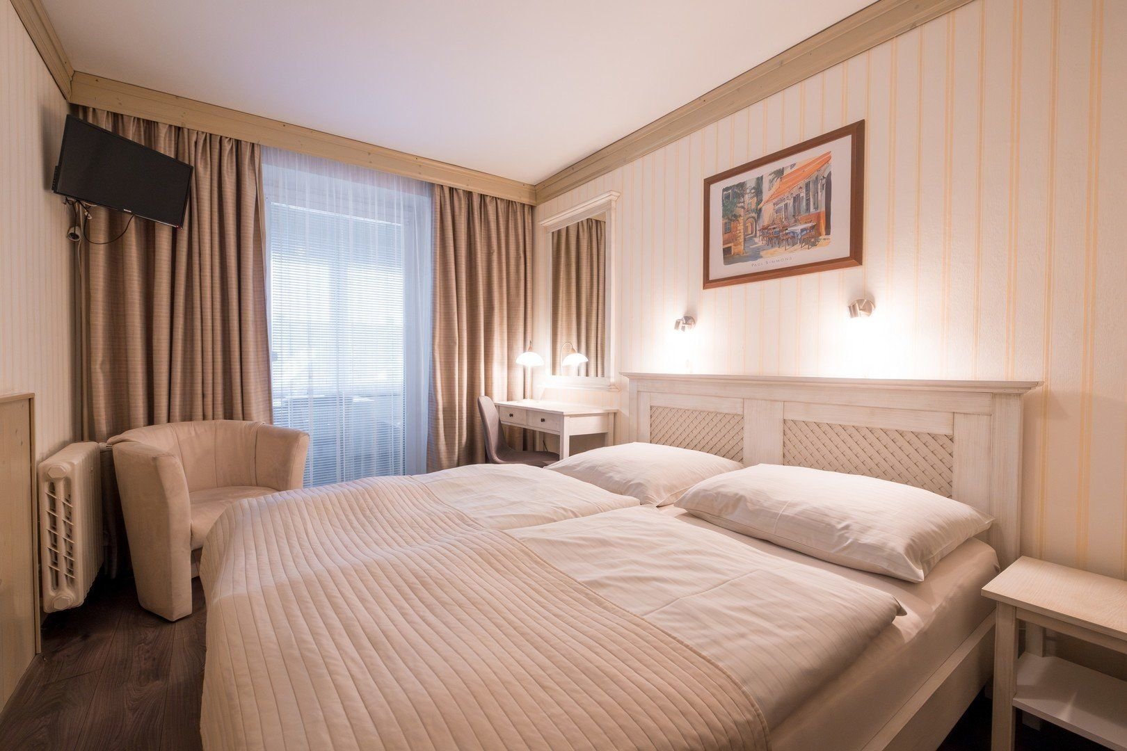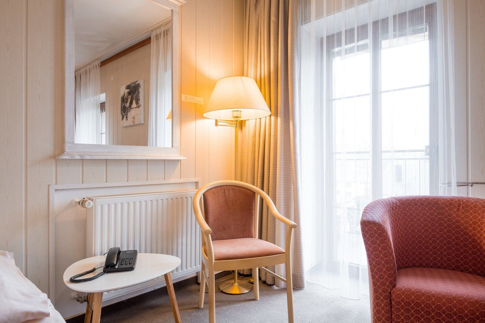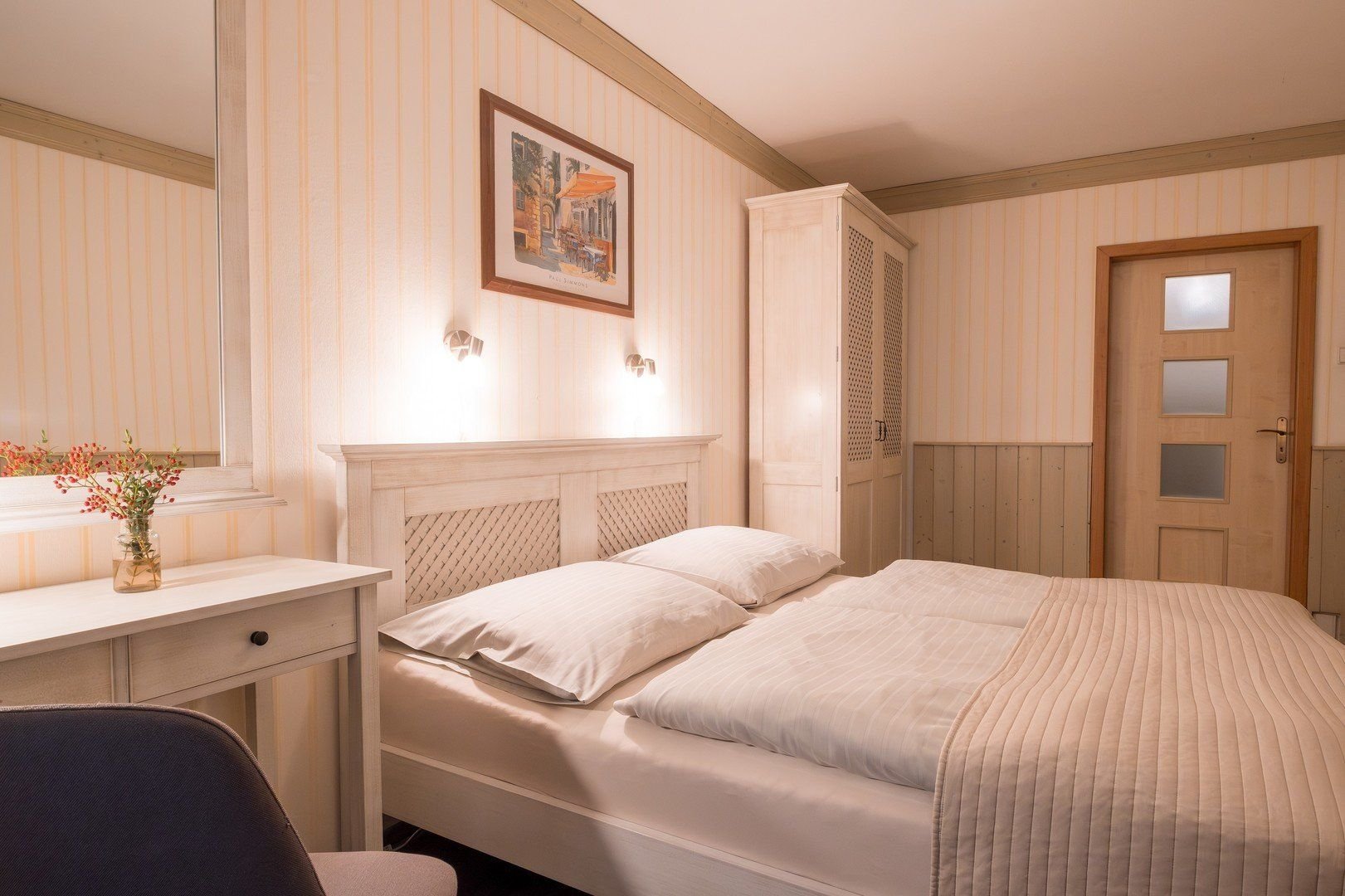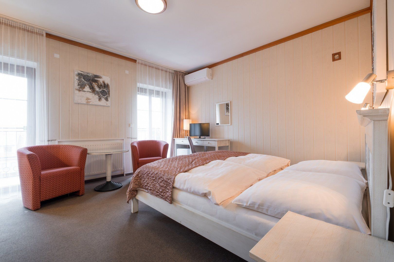 Ubytování v jednolůžkových a dvoulůžkových pokojích, třílůžkových pokojích nebo v rodinných apartmánech se 2 ložnicemi. Hotel má i 2 bezbariérové pokoje.Pokoje jsou vybaveny koupelnou se sprchou a WC, TV/SAT, telefonem, rádiem, fénem, rychlovarnou konvicí s výběrem čaje a kávy a Wi-Fi. K dispozici jsou také župany. Některé pokoje mají balkon nebo zimní zahradu.