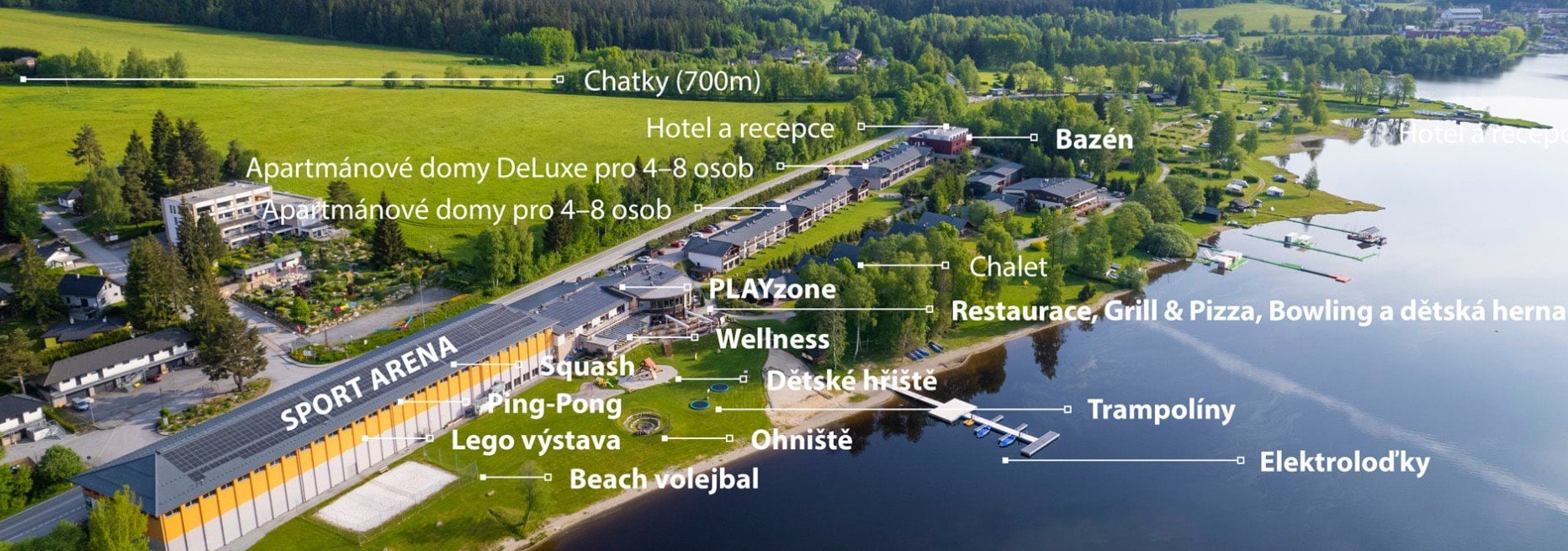 Recepce, restaurace, parkoviště, Wi-FiSport Arena Lipno -pofesionální tenisové, squashové a badmintonové kurty, stolní tenis a lezecká stěna, bowling, plně vybavené fitness, půjčovna sportovních potřeb.PLAYzone - herna vybavená PC, PS5, PS VR (za poplatek). Kromě toho mohou hosté využívat 20 metrů dlouhý bazén se slanou vodou. Je přístupný zdarma do 13:00 pro hosty ubytované v hotelu nebo vile Deluxe. Pro ostatní je přístup možný za poplatek.