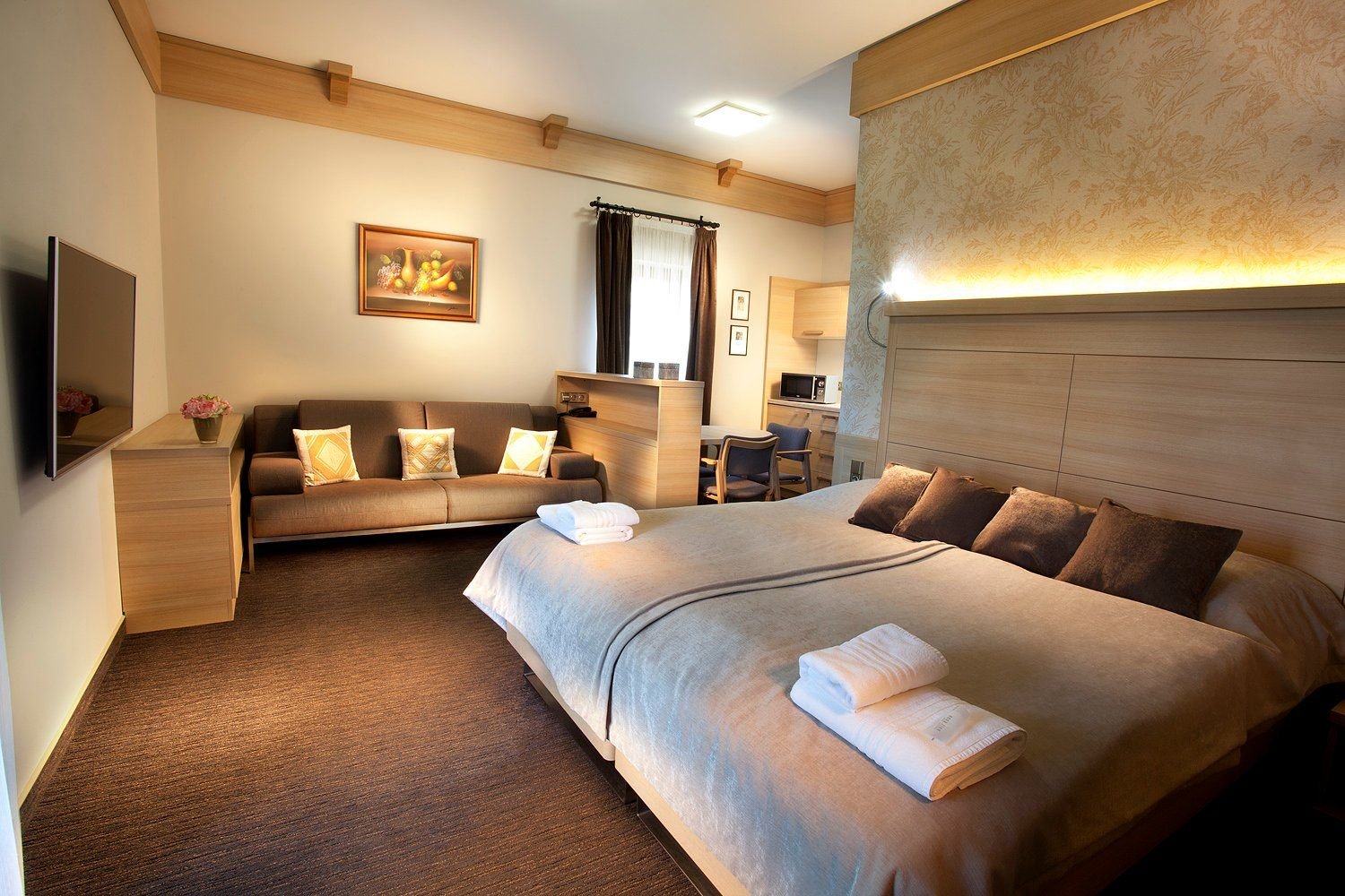 V penzionu je k dispozici 11 dvoulůžkových pokojů s klimatizací, Wi-Fi, TV, telefonem, trezorem, minibarem a fénem. Na vyžádání dále 1 bezbariérový pokoj, 2 studia, 1 dvoulůžkový apartmán, 1 rodinný pokoj, 1 čtyřlůžkový apartmán, 1 mezonetový VIP apartmán a v bezprostřední blízkosti apartmánové chatky Pálava, Agni a Aurelius.