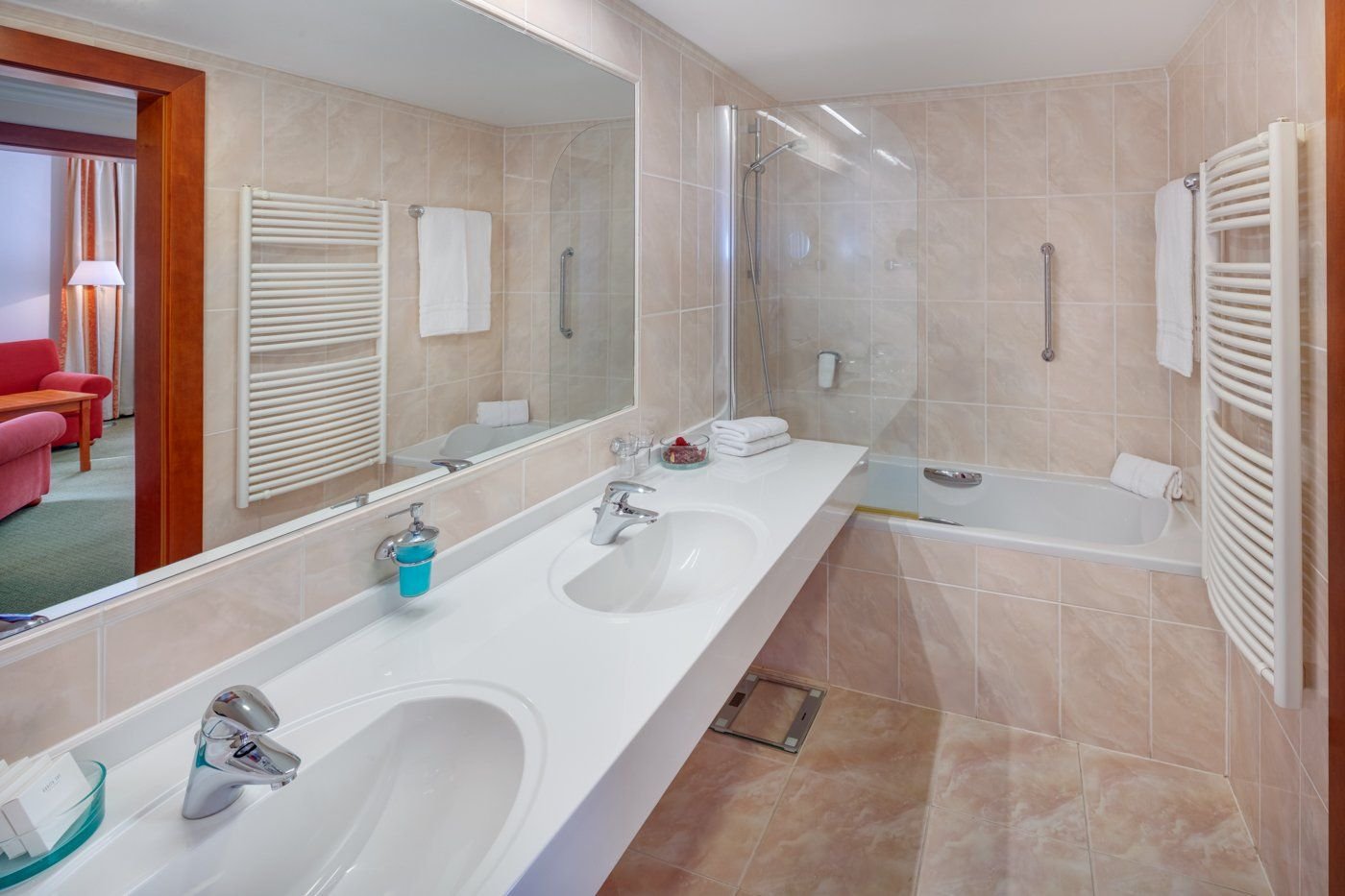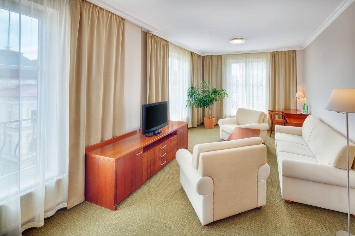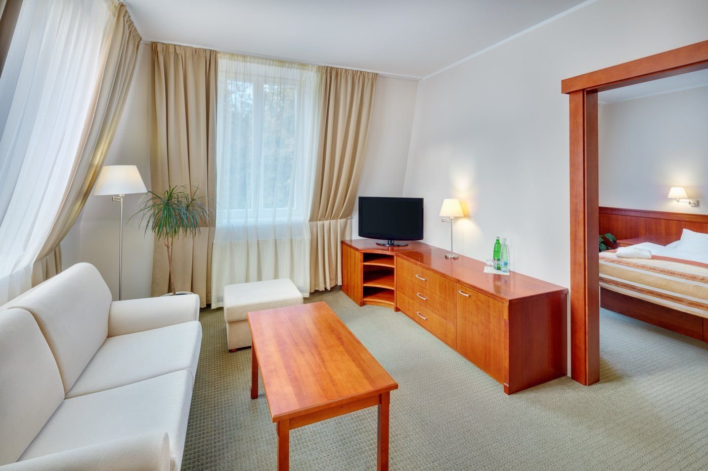 Pokoje disponují prostornými postelemi o velikosti 2x2m a dostatkem úložných prostor jak v pokoji, tak v předsíni. Pokoje typu Suite mají navíc posezení anebo oddělený obývací pokoj. V každém pokoji se nachází televize, minibar a trezor. Koupelna je vybavena prostorným sprchovým koutem nebo vanou, nechybí zde fén a hygienické potřeby. Pro lázeňské hosty nesmí chybět vybavení do Spa & Wellness – župan, přezůvky a osuška. V pokojích je k dispozici vysokorychlostní Wi-Fi připojení.