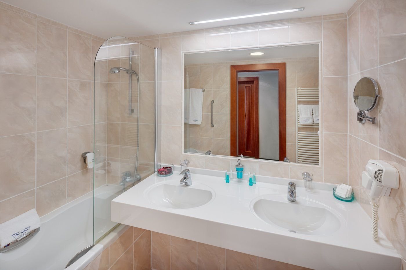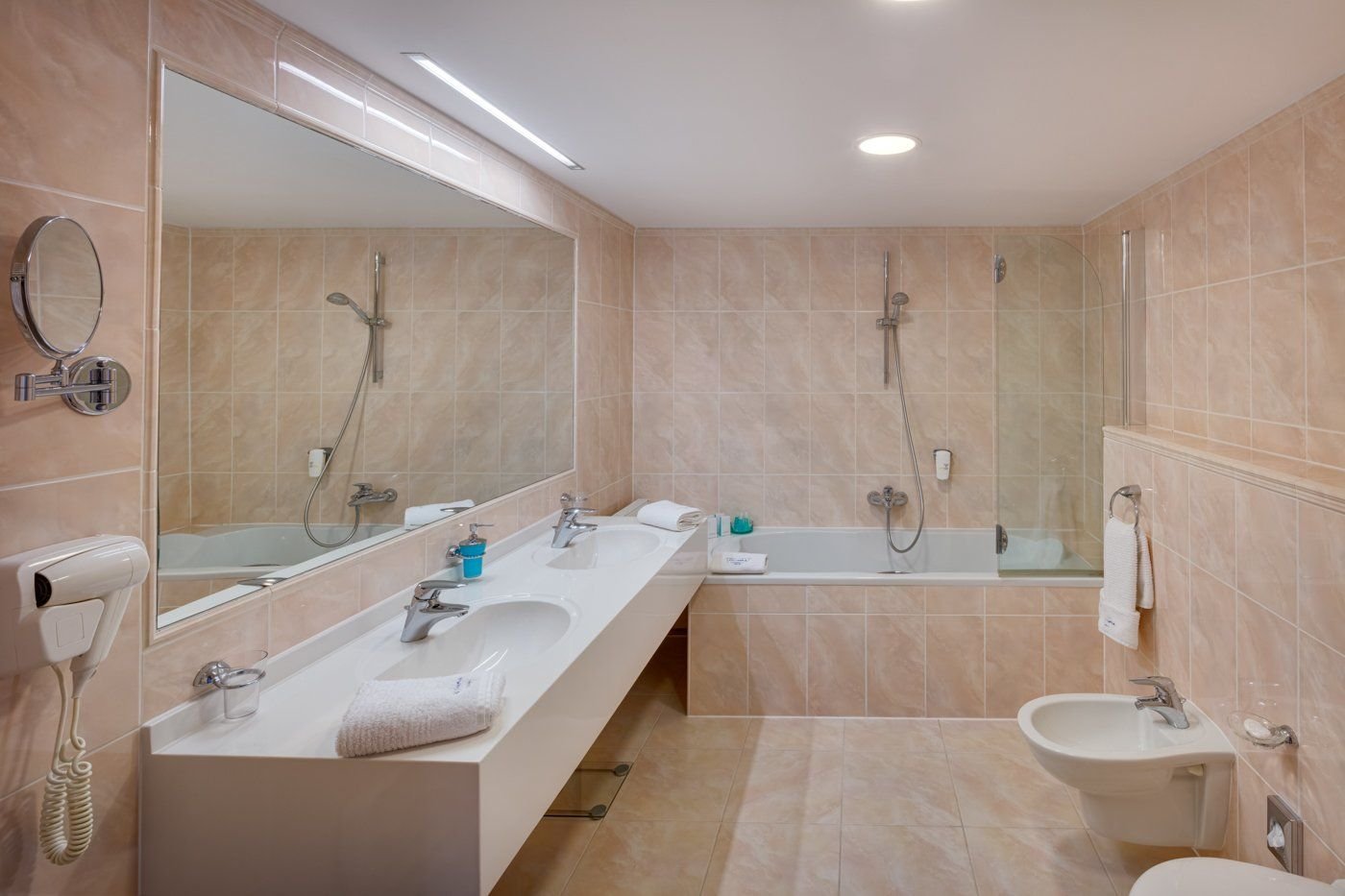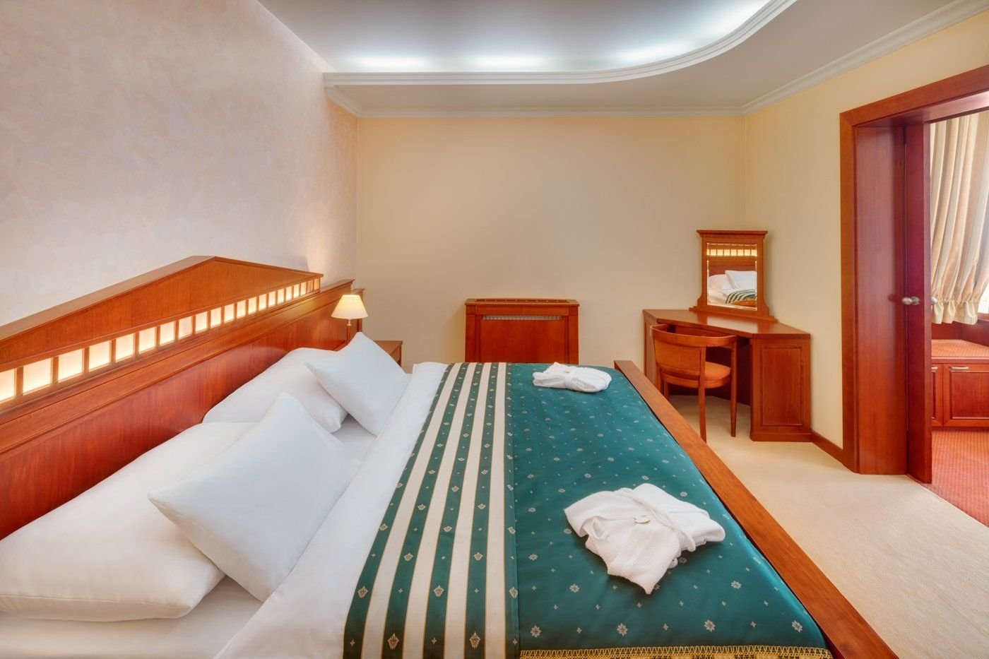 Pokoje disponují prostornými postelemi o velikosti 2x2m a dostatkem úložných prostor jak v pokoji, tak v předsíni. Pokoje typu Suite mají navíc posezení anebo oddělený obývací pokoj. V každém pokoji se nachází televize, minibar a trezor. Koupelna je vybavena prostorným sprchovým koutem nebo vanou, nechybí zde fén a hygienické potřeby. Pro lázeňské hosty nesmí chybět vybavení do Spa & Wellness – župan, přezůvky a osuška. V pokojích je k dispozici vysokorychlostní Wi-Fi připojení.