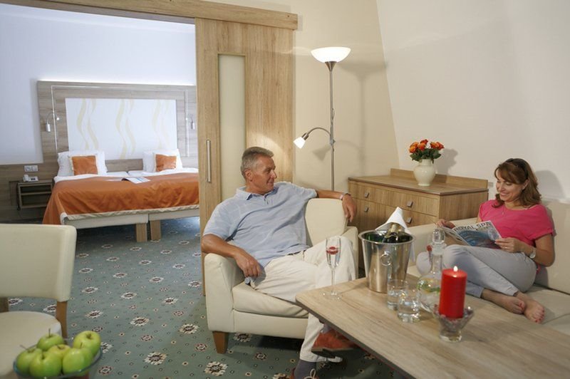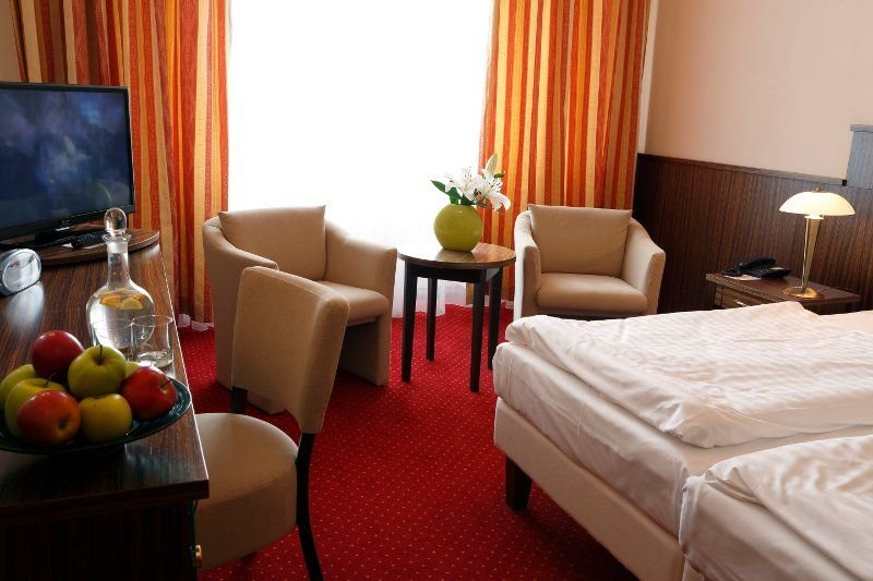 Vybavení pokojů: Sprcha / vana + WC, fén, SAT TV, rádio, telefon, trezor, lednička (minibar na vyžádání), WiFi.Komfort - jednolůžkové pokoje standardních rozměrů a větší dvoulůžkové pokoje orientované k slunečné straně převážně s francouzským oknem nebo s výhledem do přírody. Superior - větší jednolůžkové pokoje s výhledem do lesa, velké dvoulůžkové pokoje s balkonem a výhledem na město a apartmány se dvěma pokoji standardních rozměrů.Deluxe - větší apartmány se dvěma pokoji (některé s balkonem) a jednolůžkové pokoje s výhledem na město.Hotel má k dispozici 2 bezbariérové pokoje
