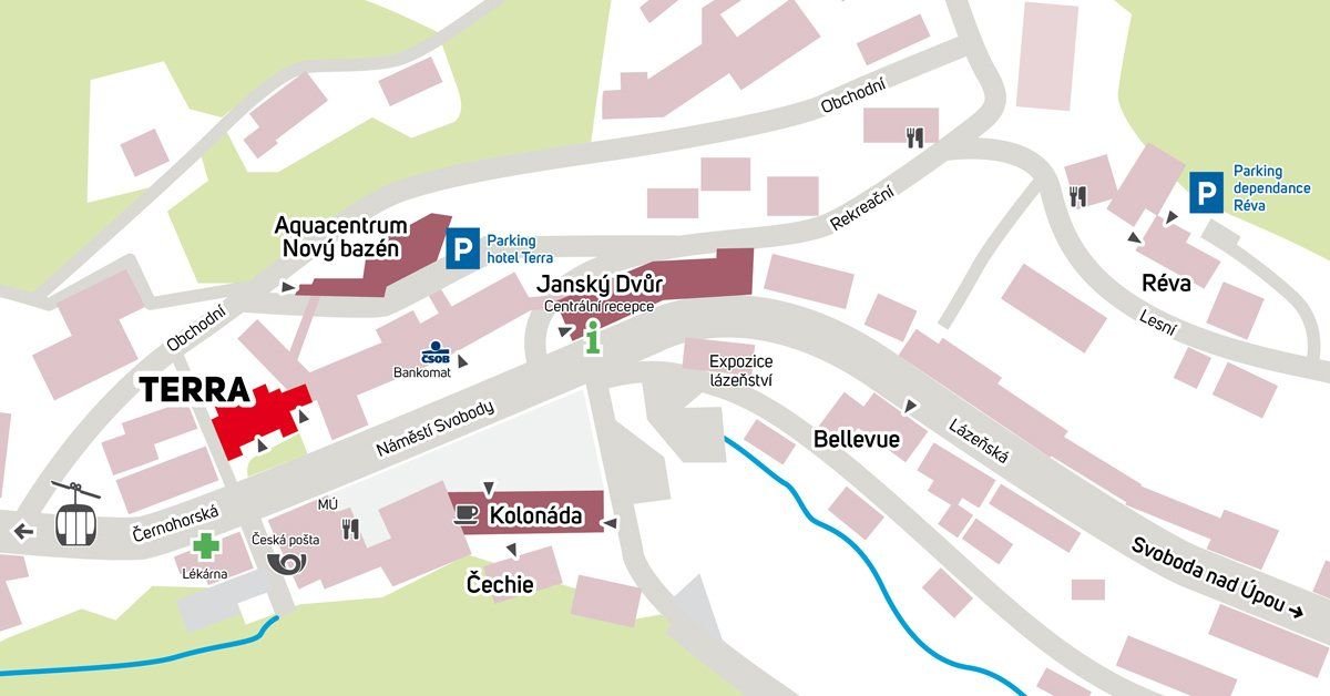Z provozních důvodů je recepce v hotelu Terra mimo provoz. Check-in všech klientů probíhá na centrální recepci v Janském Dvoře - Nám. Svobody 38, 542 25 Janské Lázně, provoz non-stop. Zde klienti obdrží veškeré informace týkající se pobytu. Check-in: od 14:00 Check-out: do 10:00Parkování - dle dostupné kapacity - za poplatek - úhrada na místěMístní poplatek - není zahrnut v ceně pobytu - úhrada na místěDomácí mazlíček - není možnýZapůjčení županu a vysoušeče vlasů po celou dobu pobytu.