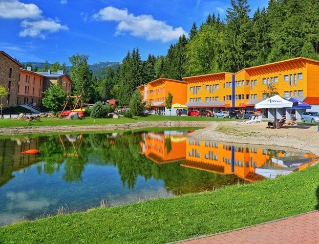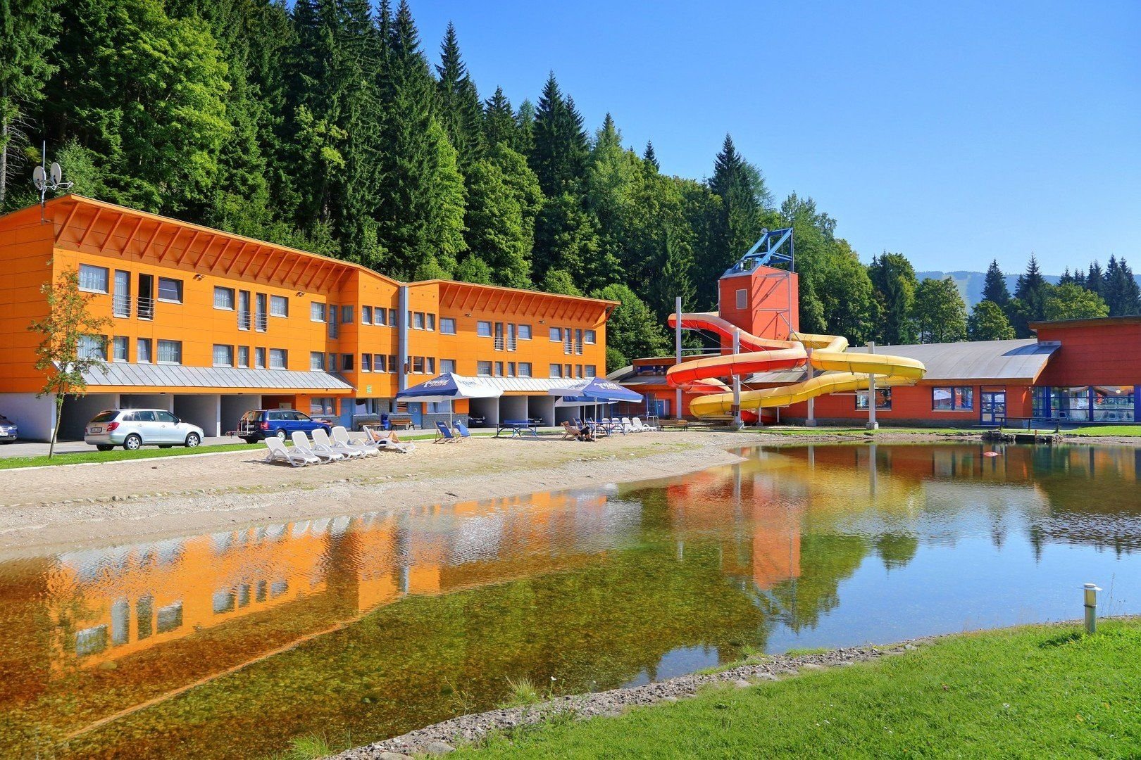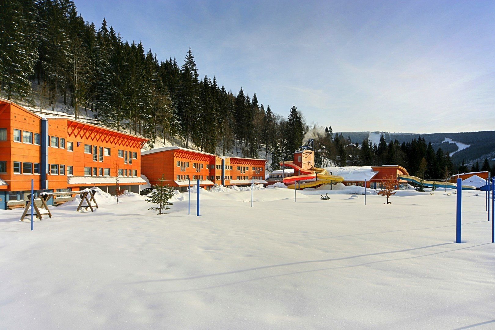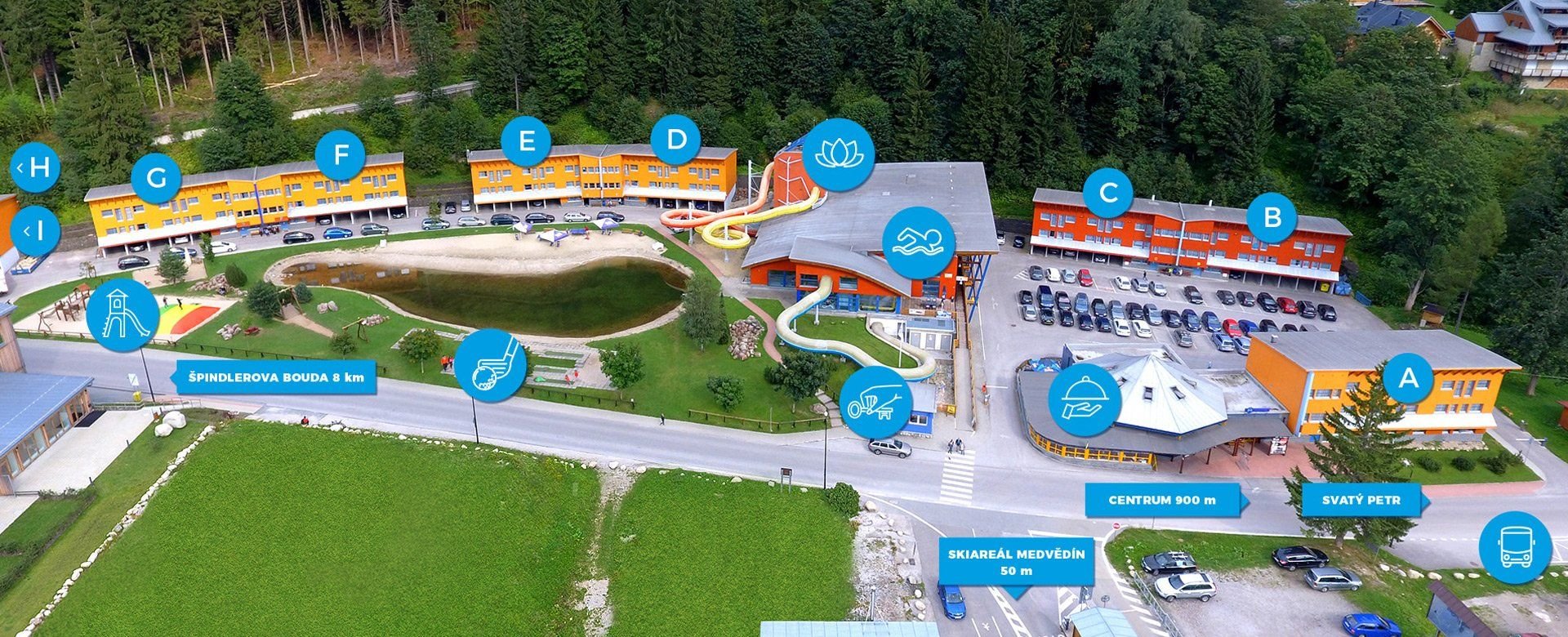 Restaurace s výhledem na sjezdovku Medvědín, bazénové bistro. Aquapark - bazén, dětský bazén, tobogán, vířivky, sauny, solná jeskyně, masáže. Masáže a vstup do saunové zóny (suchá sauna, parní sauna a solná jeskyně) za poplatek. Od dubna do konce listopadu 2025 bude uzavřen z důvodu rekonstrukce aquapark, wellness, solné jeskyně. V létě: minigolf, stolní tenis, dětské hřiště, trampolína, relax zóna u jezírka s lehátky, badminton, pétanque, půjčovna kol, koloběžek, elektrokol.