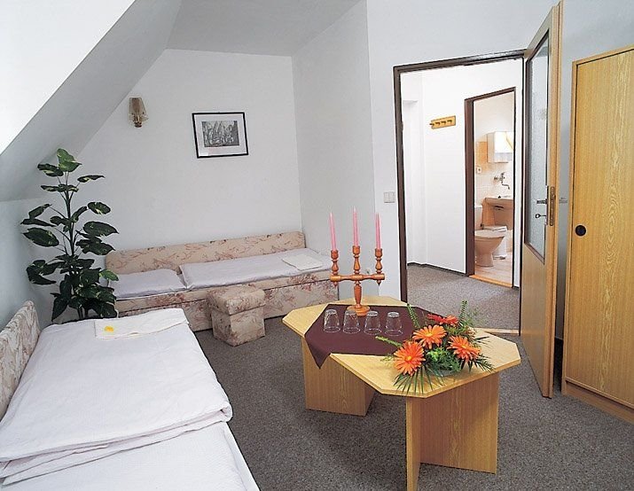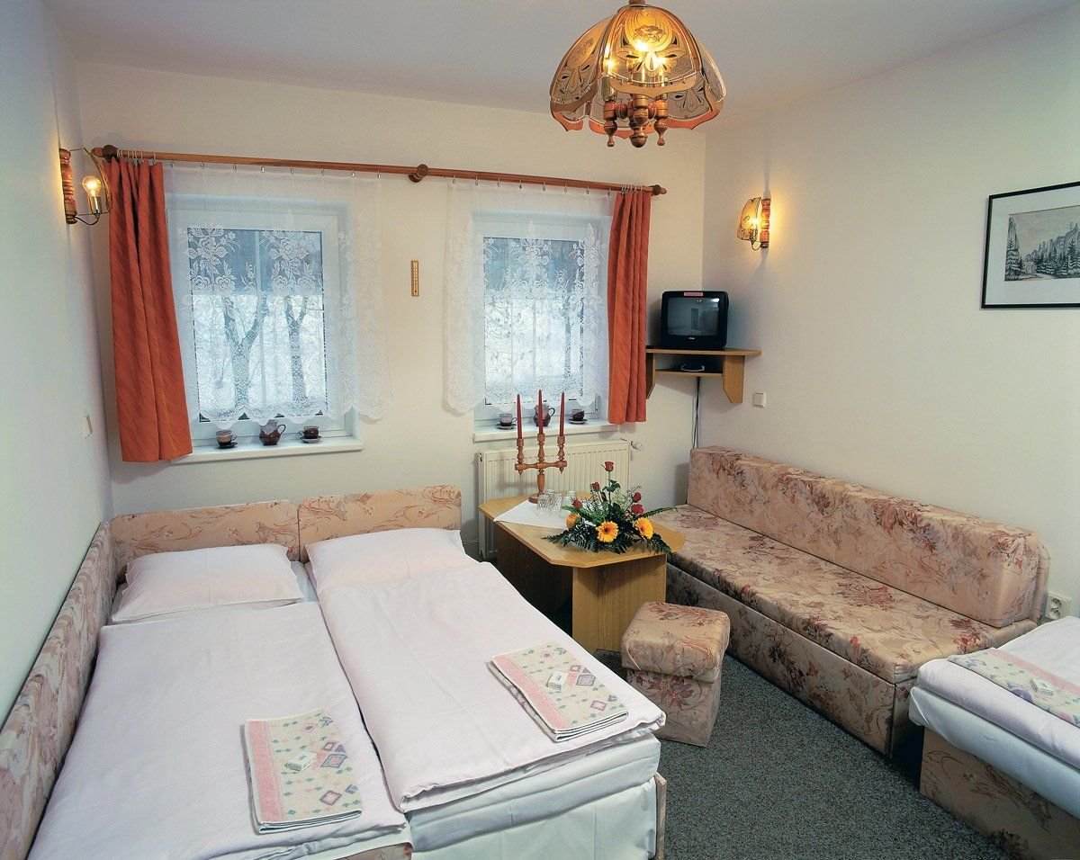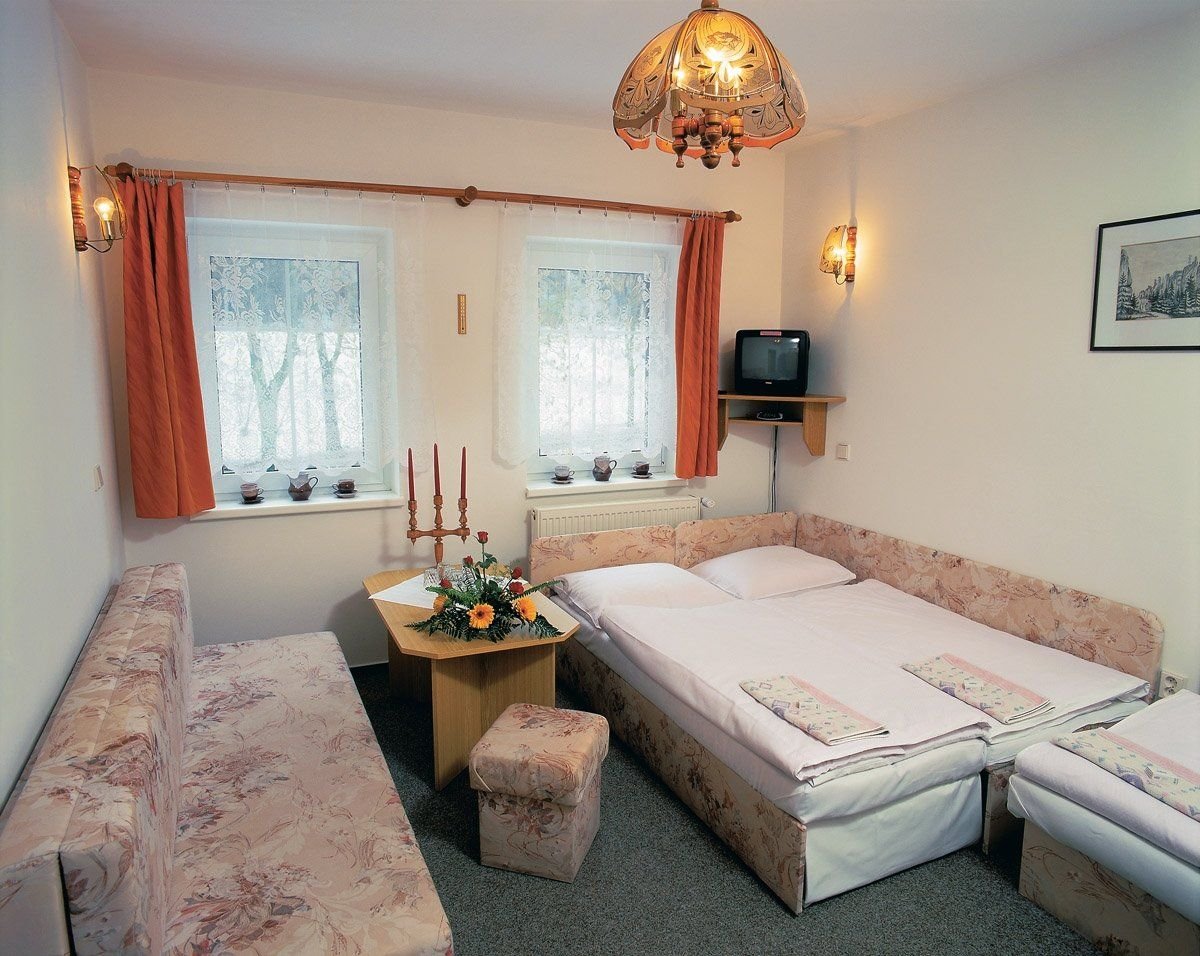 Dvoulůžkové, třílůžkové a čtyřlůžkový pokoj (dva dvoulůžkové pokoje) jsou vybaveny vlastním sociálním sařízením (vana nebo sprchový kout, WC), TV, na patře společná lednice.