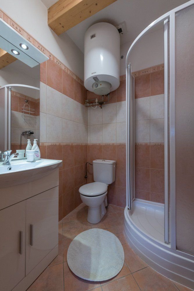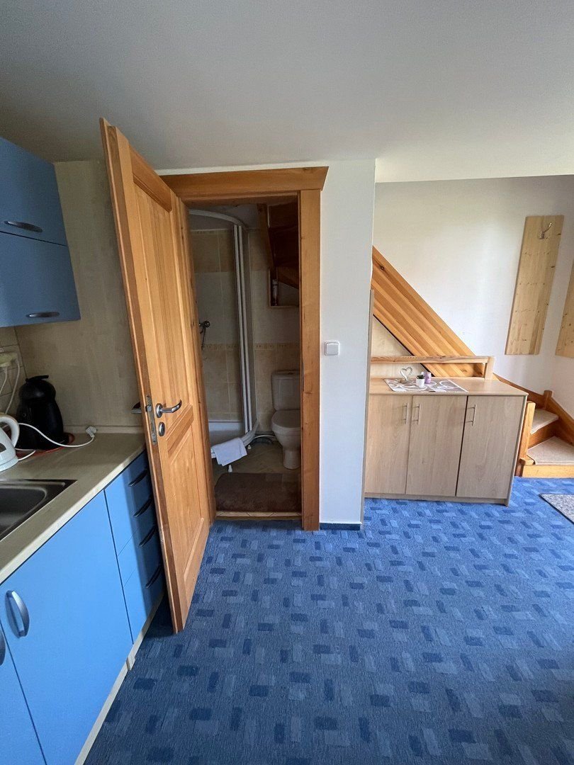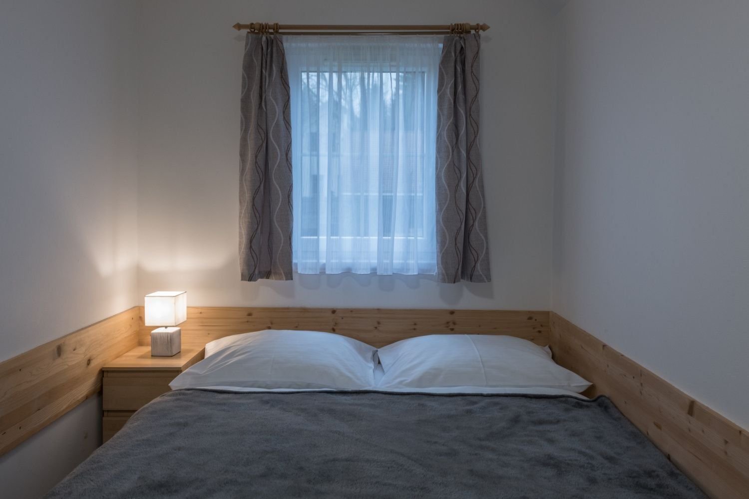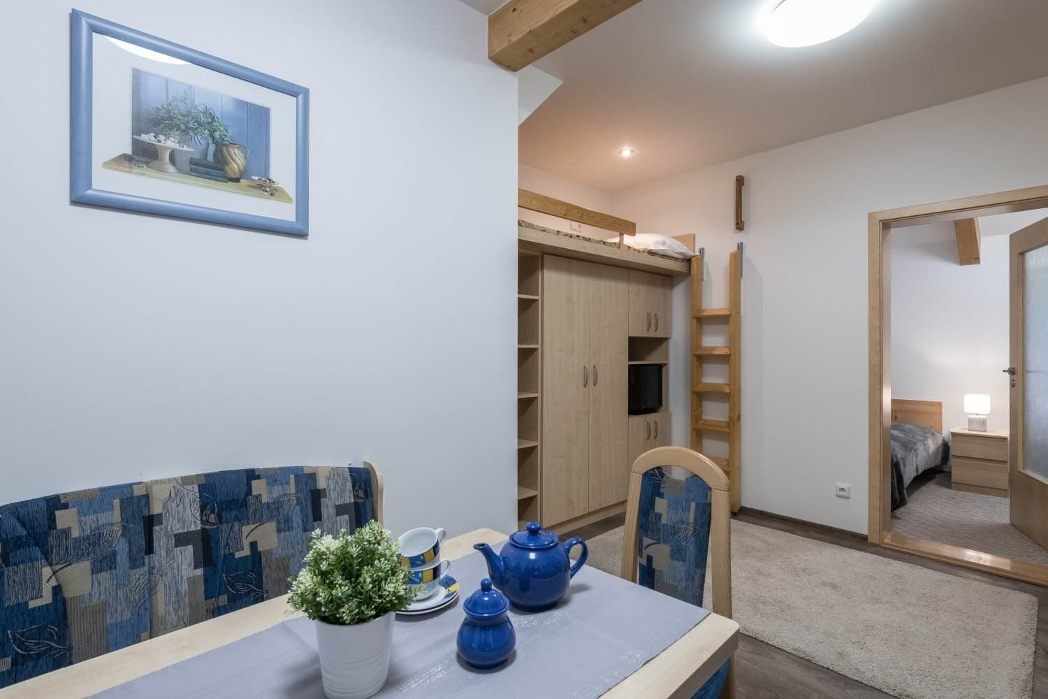 Všechny apartmány mají vlastní sociální zařízení a vybavený kuchyňský kout -většinou součástí obývacího pokoje (lednice, mikrovlnná trouba, 2 plotýnkový vařič, kávovar Dolce gusto, varná konvice), jídlení kout, TV-SAT a Wifi, sušák na prádlo,vysoušeč obuvi (není v domku "D" a "H"). Apartmán A "Oranžový" - ideální pro 2 dospělé a max 2 děti nebo 3 dospělé osoby (vzhledem k prostoru). V ložnici jsou 3 pevná lůžka, 2 přistýlky v obývacím pokoji (rozkládací 2místná sedačka a vyvýšené lůžko). Celkový počet lůžek 3+2.Apartmán B "Modrý"- doporučujeme vzhledem k prostoru pro 4 osoby. V ložnici 4 pevná lůžka, rozkládací 2 místná sedačka a nad ní možnost dvou přistýlek na vyvýšeném lůžku.Celkový počet lůžek 4+2Apartmán C "Zelený" - Podkrovní apartmán ve společné budově se samostatným vchodem ze společné zastřešené terasy a posezením. Do podkroví vedou užší, příkré schody. Ložnice s 4 pevnými lůžky a obývacím pokojem je oddělená od kuchyně dveřmi. Celkový počet lůžek:4 + 1 přistýlka (gauč v obytném prostoru).Zahradní domek "D" - patrový domeček s balkonem s malým posezením, umístěný v zahradě. Do podkrovní ložnice s 2 pevnými lůžky se jde po užších schodech do sníženého patra.Apartmánový domek "E"- apartmán v samostatném domě s dřevěným otevřeným mezonetem, terasou, podlahovým topením, krytá terasa s posezením, ložnice v přízemí se 2 lůžky, mezonetový ložnice - otevřený prostor ve štítu domu se 4 pevnými lůžky. Celkový počet lůžek: 6+1 (do podkroví lze přidat matraci)Prázdninový dům "H" - moderně zařízený dům se 4 ložnicemi, terasou, koupelnou s vanou, 2x WC, ideální k využití sauny (za poplatek), která je hned u domu. Obývací pokoj s krbem a přímým vchodem na terasu s výhledem na sjezdovky, kuchyň s barovým pultem, ložnice s manželskou postelí, v podkroví ložnice se 2 lůžky (možnost přistýlky pro dítě - matrace), druhá ložnice s manželským lůžkem, která je průchozí s další ložnicí se 2 lůžky. Celkový počet lůžek 8+1