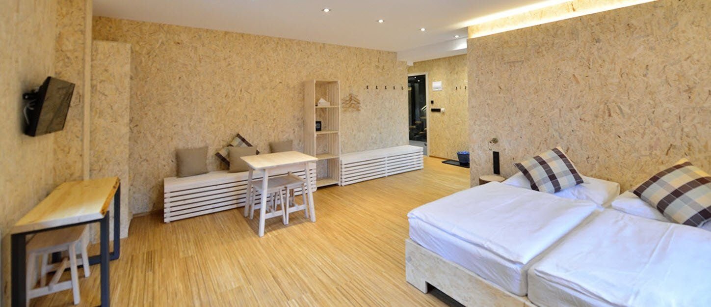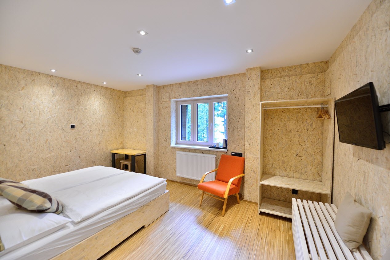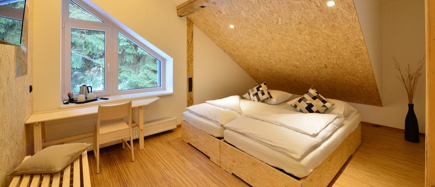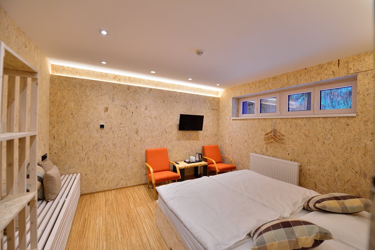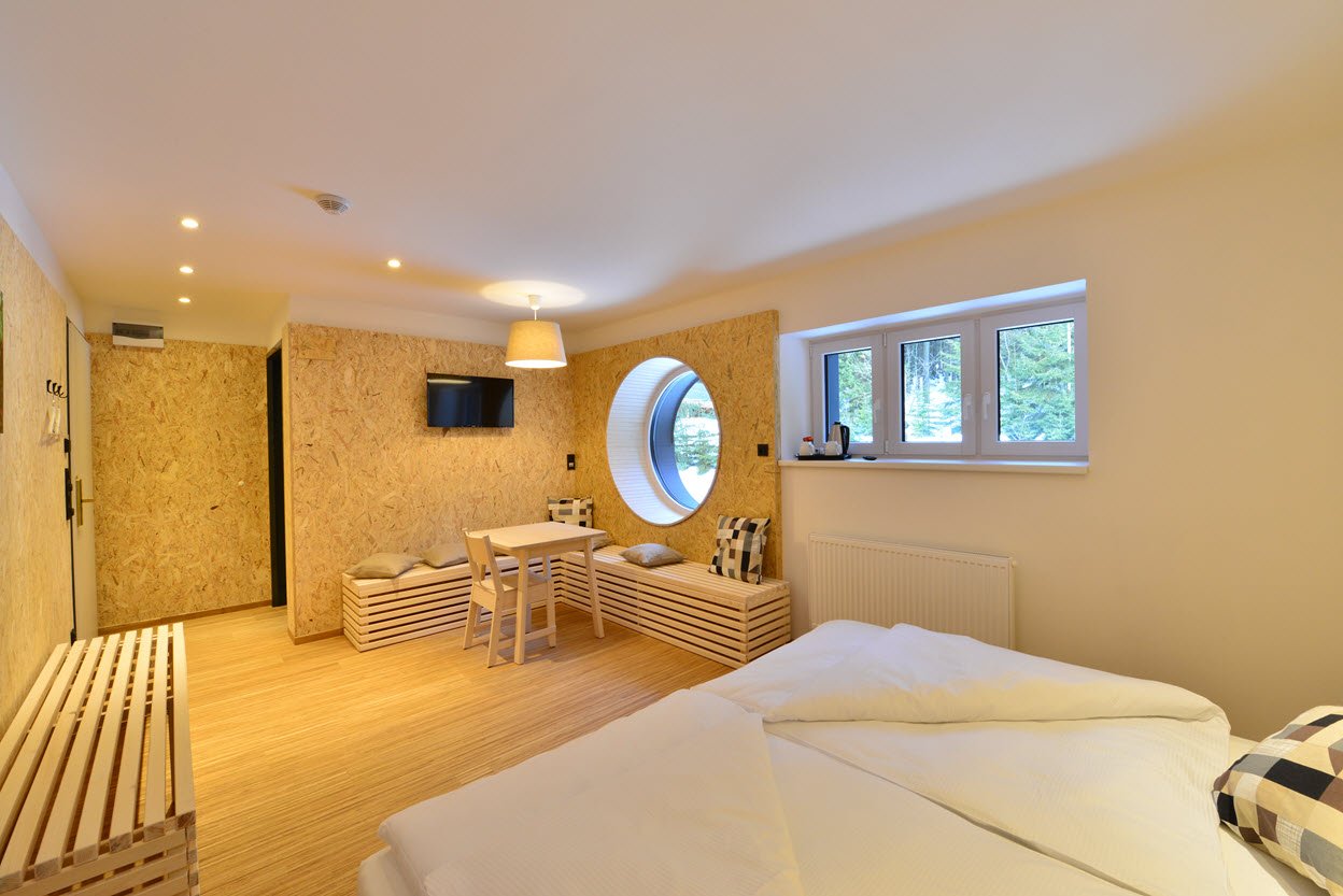 Komplex několika budov. Ubytování je možné v pokojích, apartmánech nebo srubech až pro 6 osob.Dvoulůžkový pokoj - malý a střední pokoj. Dvoulůžkový pokoj s možností přistýlky - velký pokoj - nachází se v budovách B, C, D. Pokoje mají nadstandartně velká lůžka se zdravotními matracemi, prostorná koupelna se sprchovým koutem, bidetem, fén, TV, set na přípravu kávy a čaje.Hosté v budově B profitují z možnosti využít přímo v objektu se nacházející saunu, aniž by museli vycházet ven a hosté v budově C a D mají v těsné blízkosti také bazén.Apartmány a sruby - ceny na vyžádání.