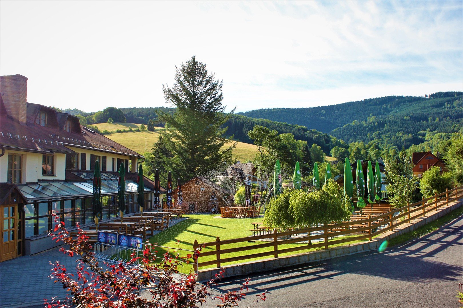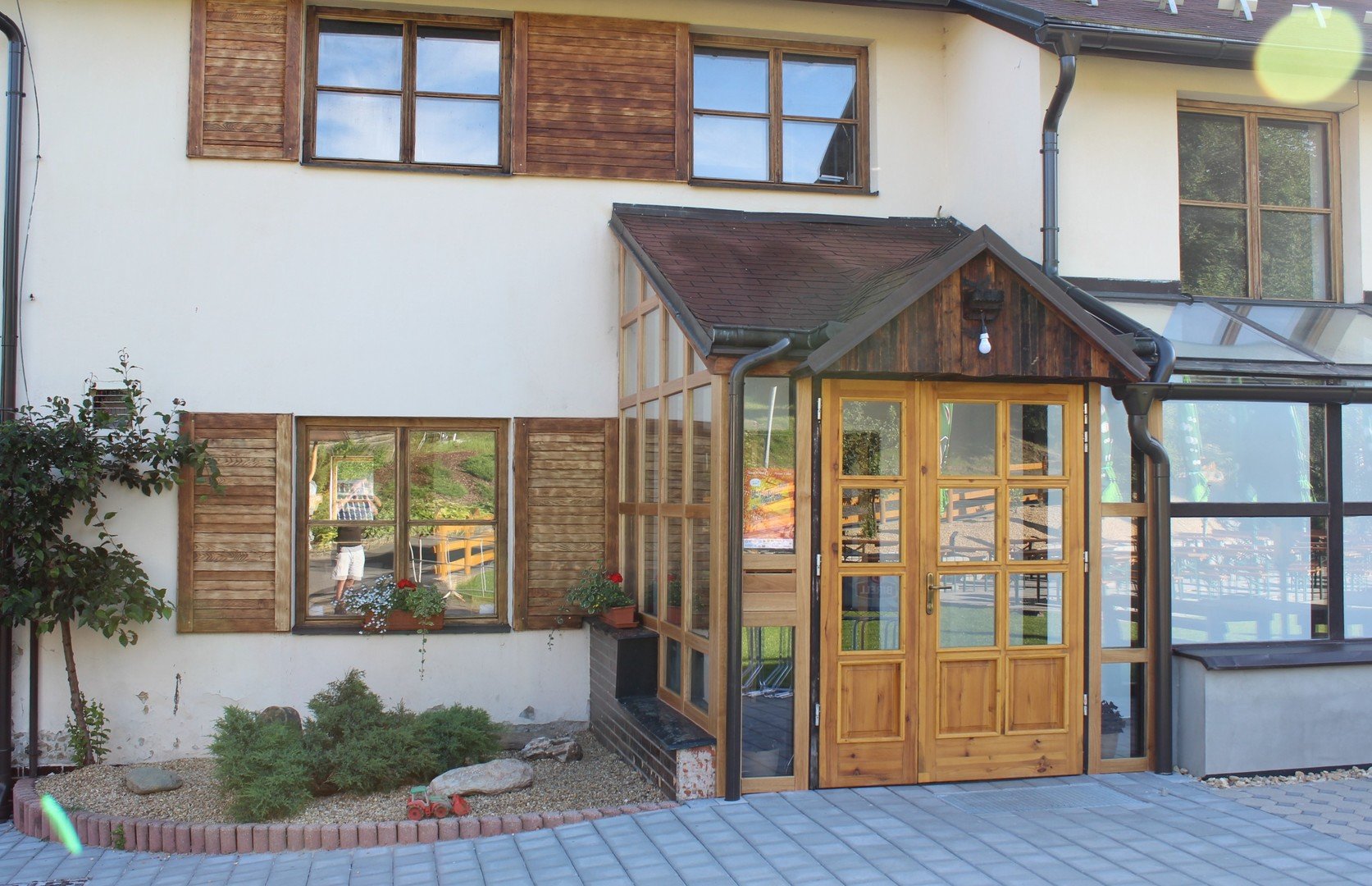 Výtah, restaurace s kavárnou, stylová hospůdka, venkovní terasa s vlastním výčepem a grilem, zahrada s dětským hřištěm, WiFi v celém hotelu, úschovna kol, 2 konferenční místnosti, opalovací lehátka.