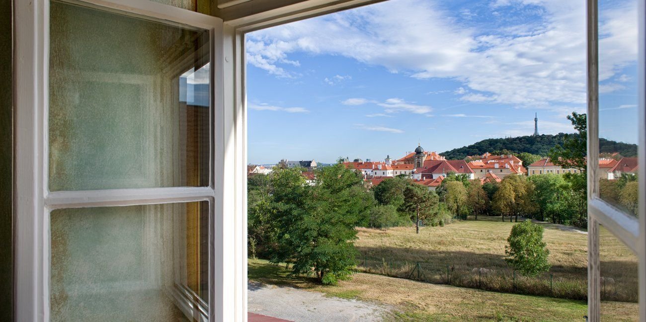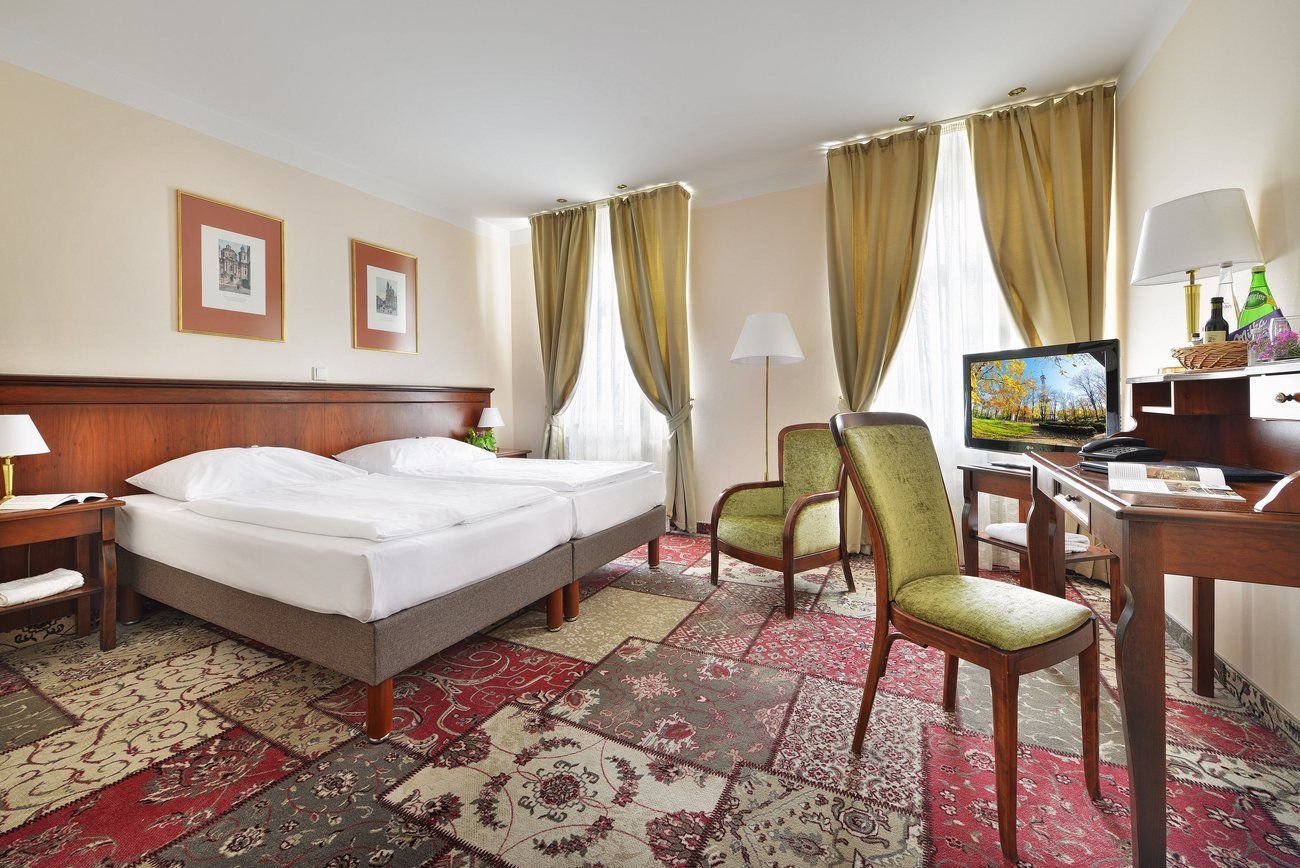 Elegantně zařízené 1-2 lůžkové pokoje (některé s možností přistýlky) mají vlastní koupelnu se sprchou nebo vanou a WC, podlahovým topením v koupelně a fénem. Pokoje jsou vybaveny satelitní LCD TV, elektronickým trezorem, telefonem, větrákem, WiFi, zatemňovacími závěsy a protialergickým ložním prádlem. Některé pokoj s výhledem na Pražský hrad a na Petřínskou rozhlednu. Hotel zapůjčí zdarma osušky, žehlička a žehlící prkno, deštník a síťový adaptér.