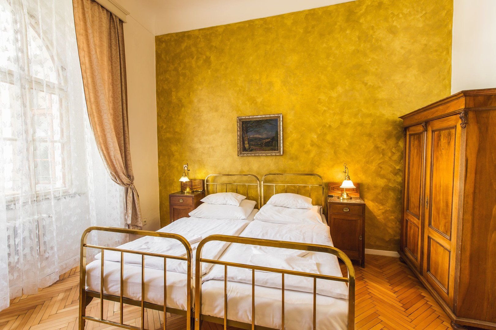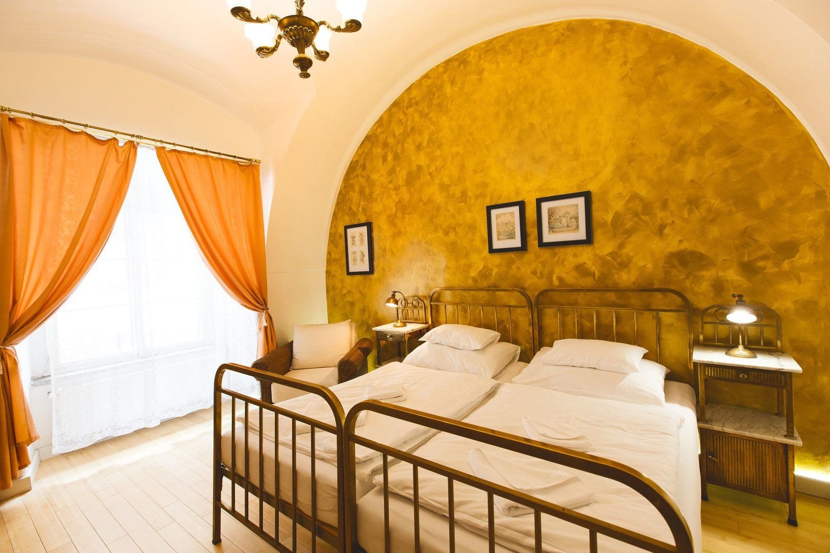 Hotelové pokoje s možností přistýlky jsou vybaveny starožitným nábytkem a uměleckými prvky a odpovídají atmosféře historické budovy. Pokoje Standard jsou vybaveny v jednoduchém stylu, mají minibar, TV, Wifi, malé posezení a vlastní koupelnu s WC a sprchovým koutem nebo vanou a nacházejí se ve zvýšeném přízemí a prvním poschodí. Za příplatek pokoje Superior, které jsou prostornější a nacházejí se v prním a druhém poschodí.