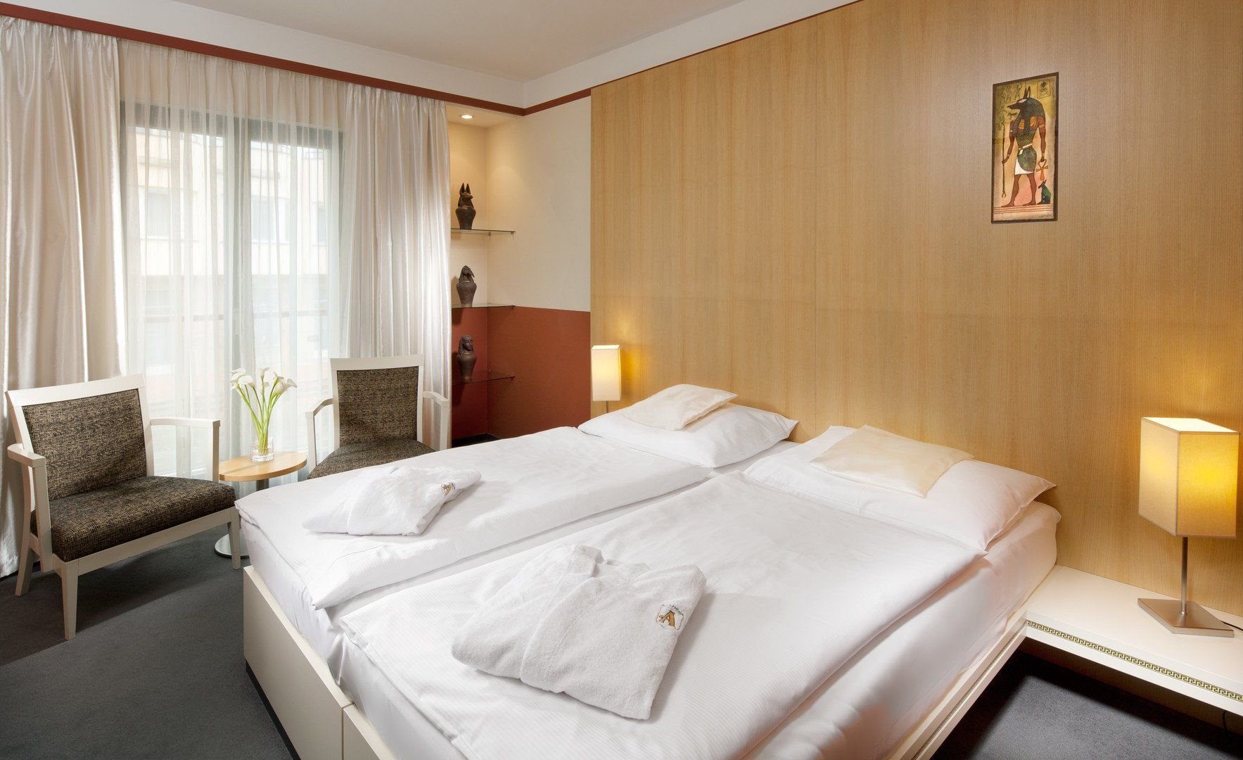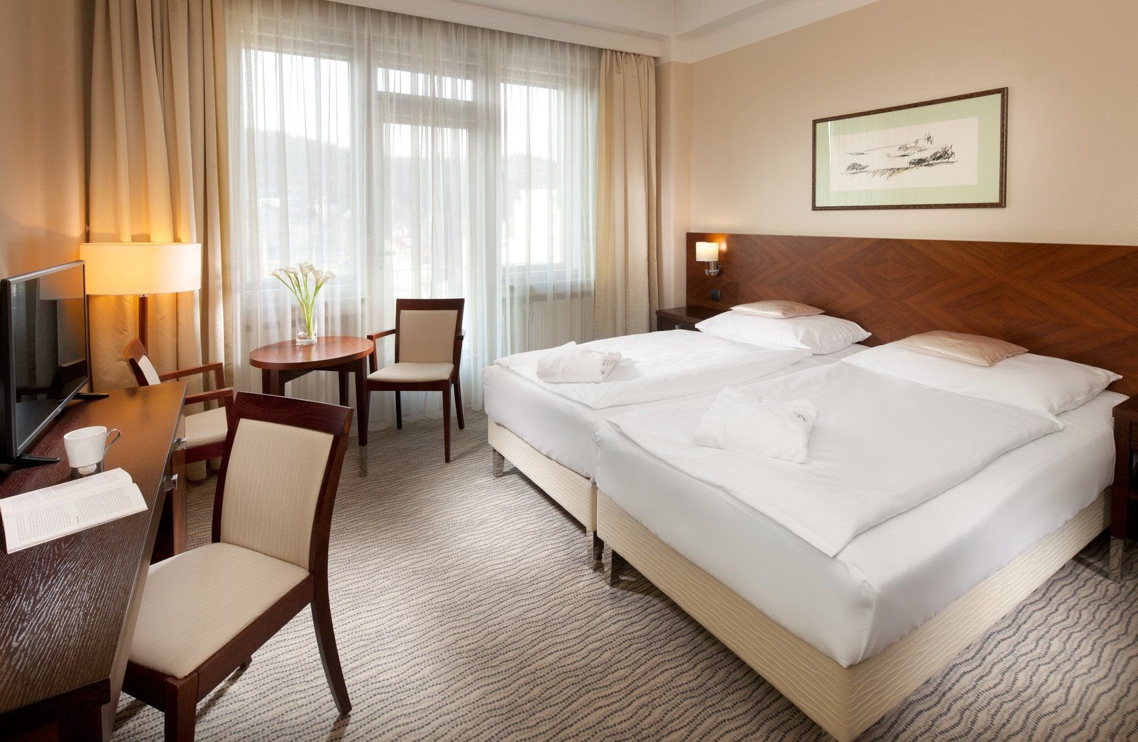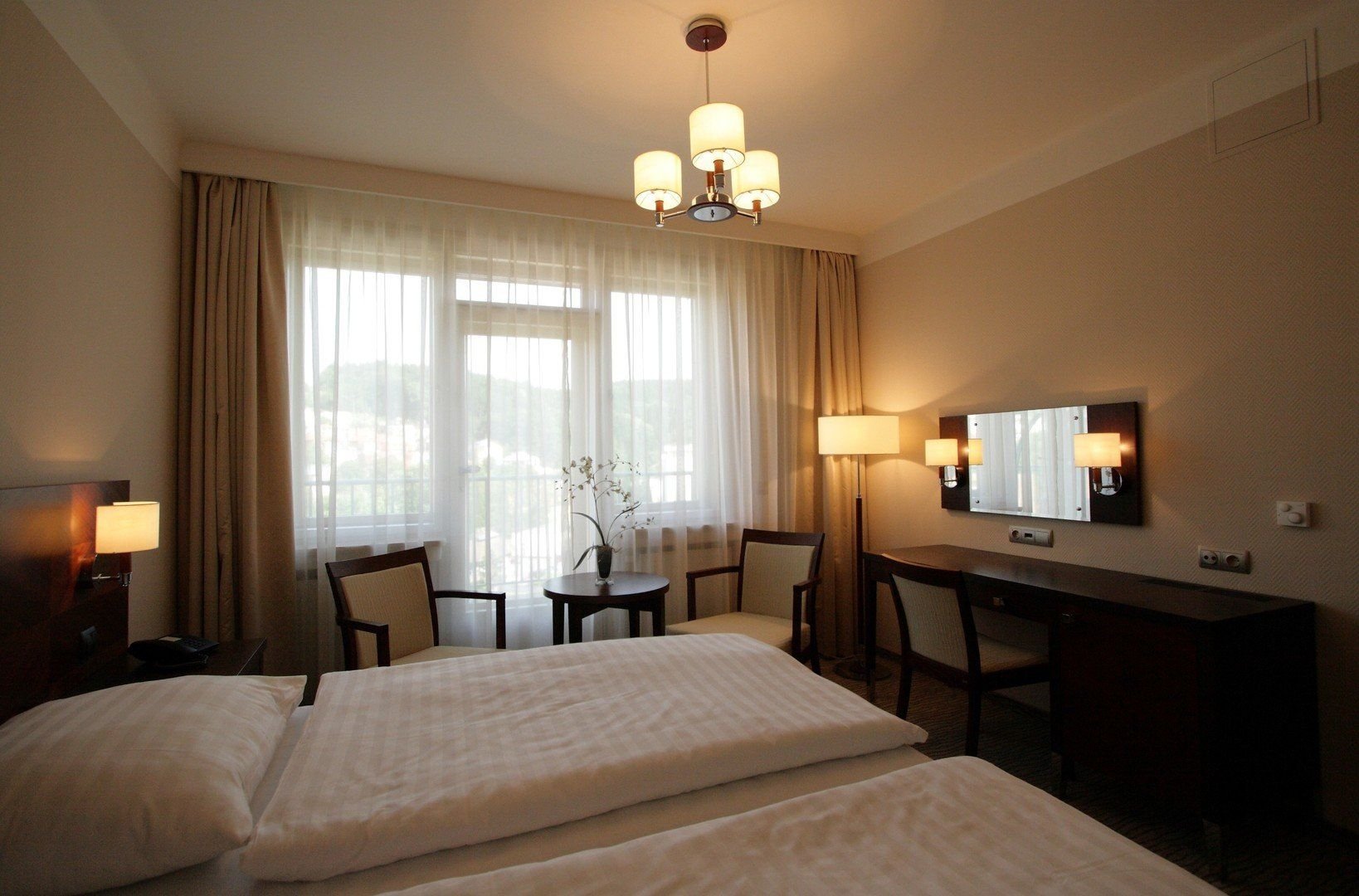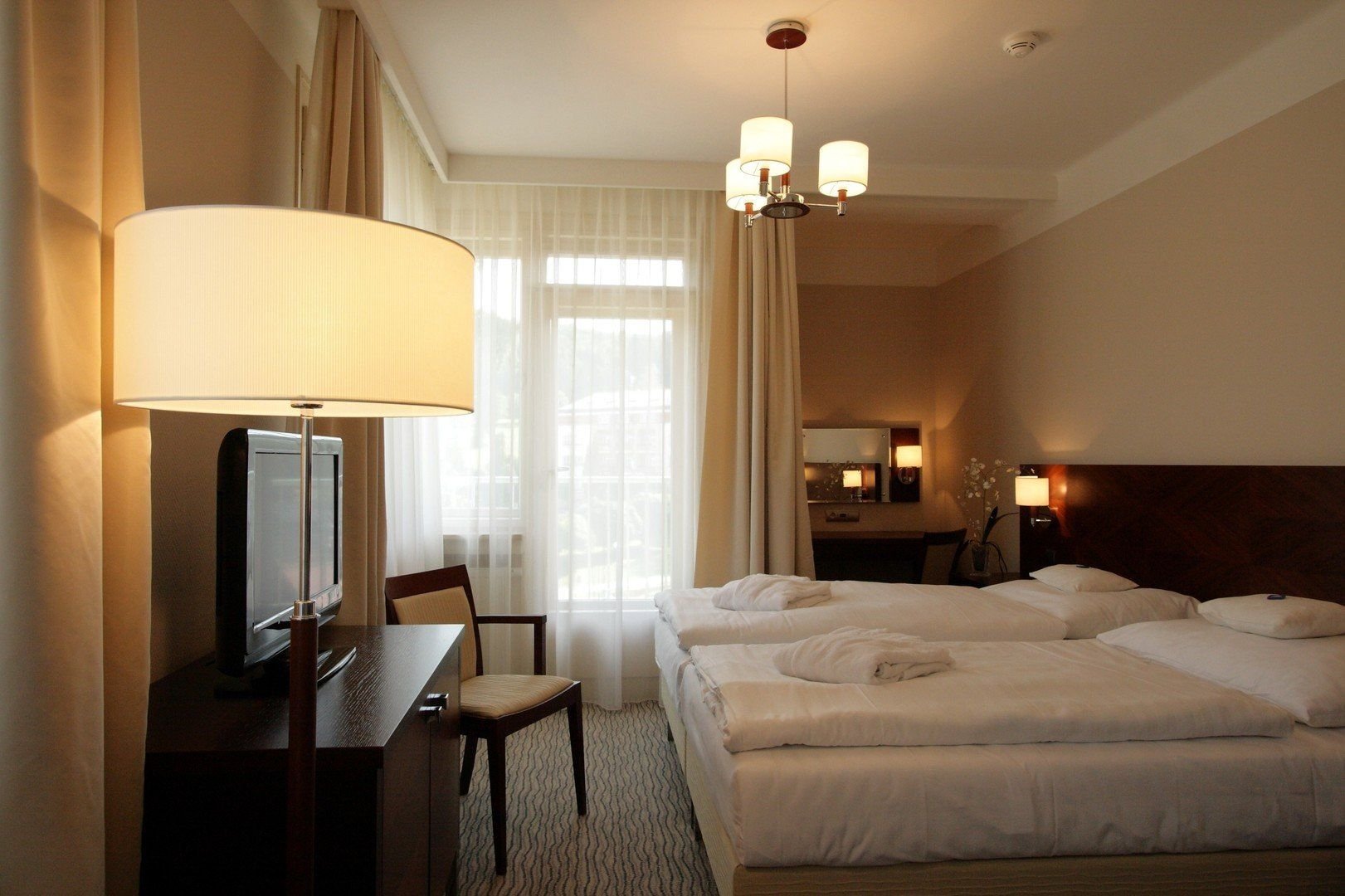 Jedno a dvoulůžkové pokoje s koupelnou, SAT/TV, WiFi, telefon, minibar, trezor, fén, župan, některé pokoje s klimatizací