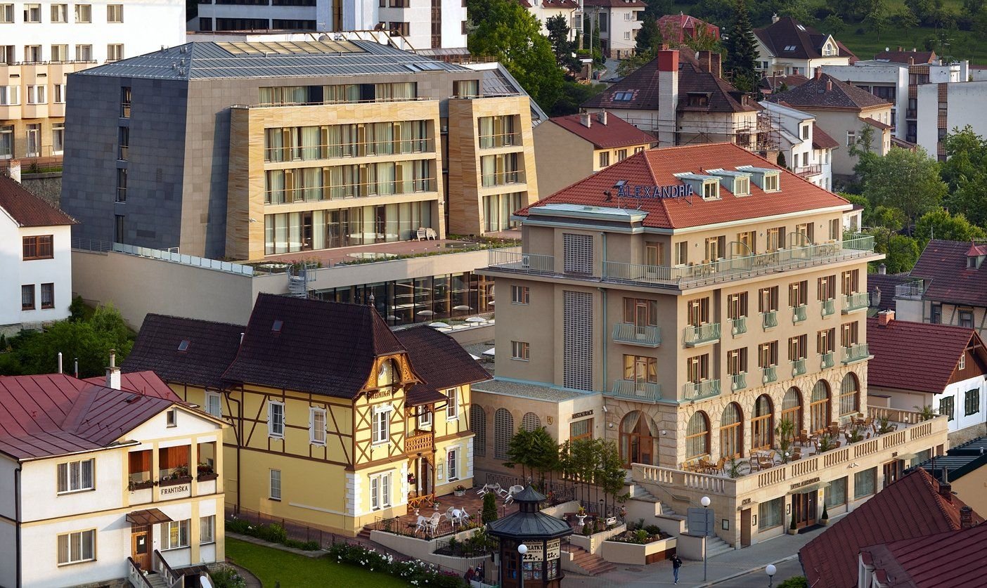 Nachází se přímo v centru lázeňského města a po rozsáhlé a nákladné rekonstrukci navazuje na svou tradici stylového a noblesního hotelu v Luhačovicích. Dvě propojené budovy – dva světy. To je luxusní hotelový komplex Alexandria. Hlavní budova nabízí pokoje ve stylu 30. let minulého stol. Nová, moderní hotelová část reprezentuje současnou generaci nejmodernějších evropských lázní. Dvě podlaží wellness centra jsou velkoryse řešena ve stylu starořímských lázní. Obě patra jsou propojena prosklenným panoramatickým výtahem.