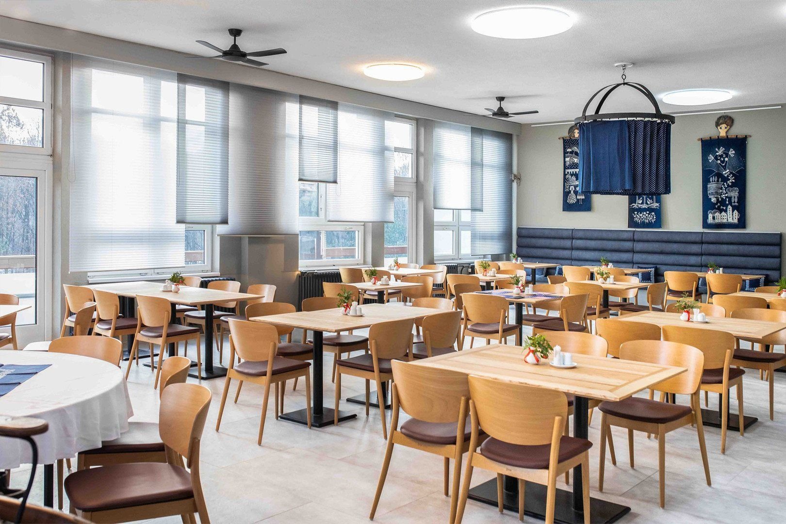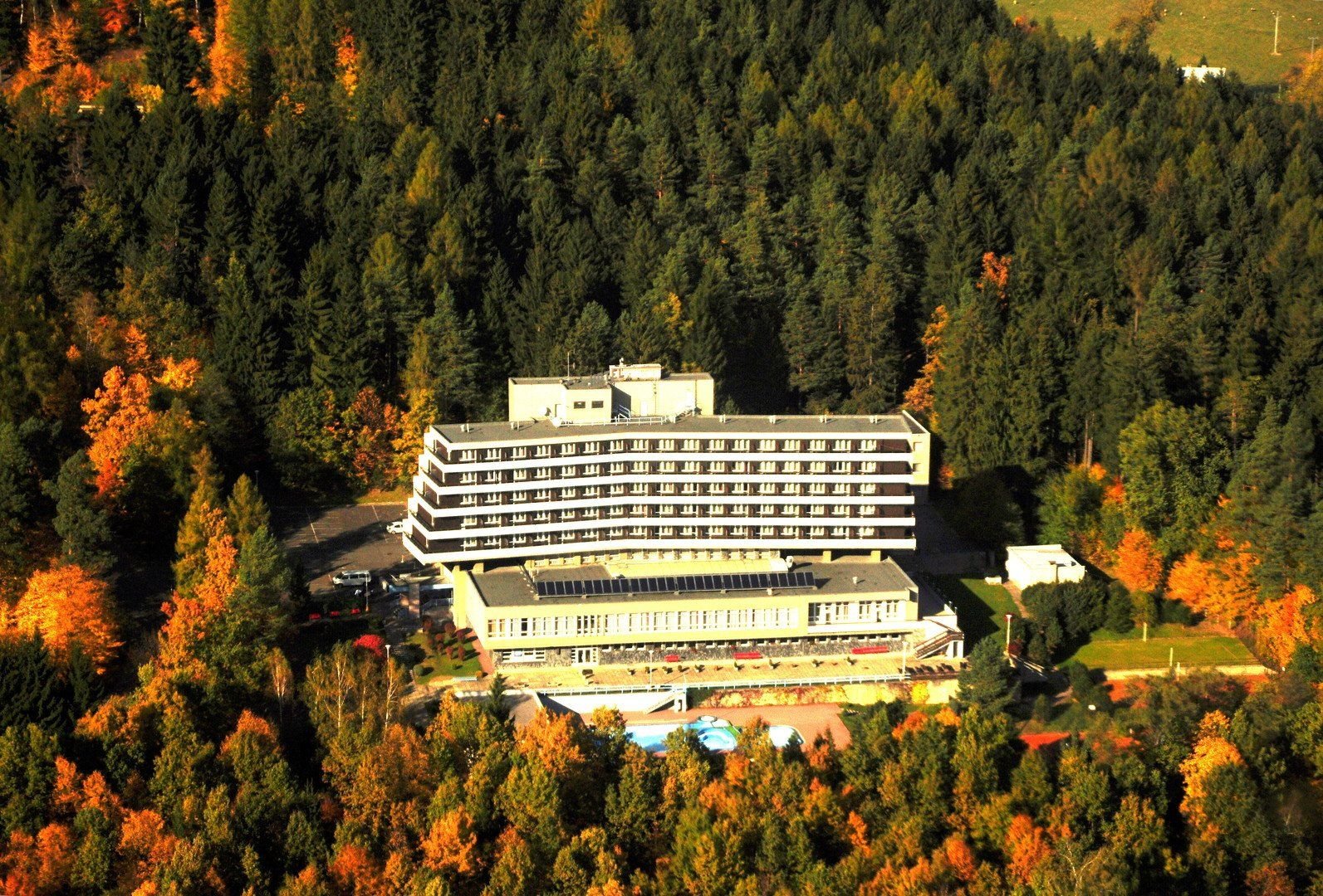 Recepce, restaurace Indigo, Lobby bar a restaurant Modrý Jelen, Relax Food Truck, Relax centrum - krytý bazén (9x 6m), sauna (oboje pro ubytované hosty zdarma), masáže a koupele, vodoléčba a elektroléčba za poplatek, fitcentrem. Dále k dispozici automatická kuželna se dvěma drahami, tenisový kurt, volejbalové hřiště, minigolf, stolní tenis - vše za poplatek, dětská herna. V hotelu je výtah. WiFi připojení zdarma. Elektronabíječka pro 2 vozy.