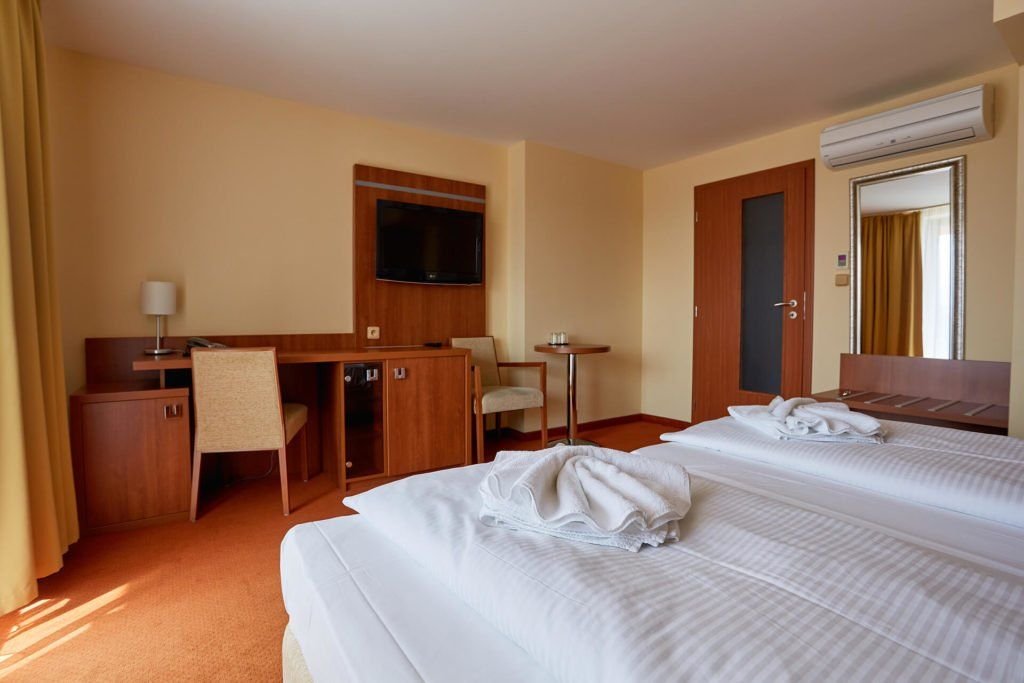 Dvoulůžkové pokoje s možností přistýlky jsou vybaveny TV, telefonem, Wifi, klimatizací, ledničkou a vlastní koupelnou s WC. Na vyžádání rodinné apartmánys propojenými ložnicemi.