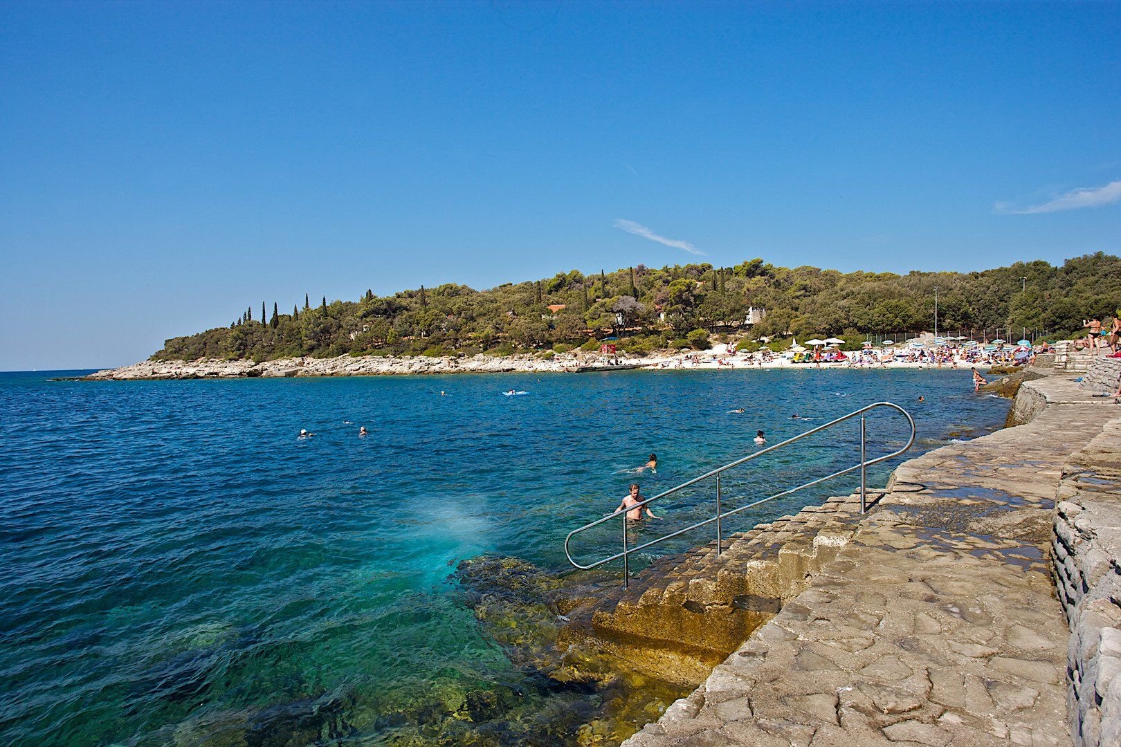 Kamenitá a oblázková pláž se nachází cca 100 - 200 m od apartmánů. Přístup na pláž je po schodech.