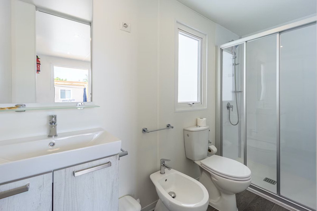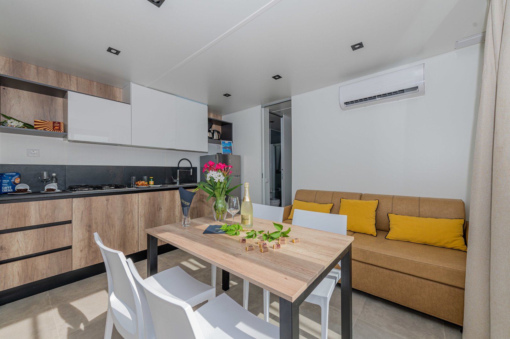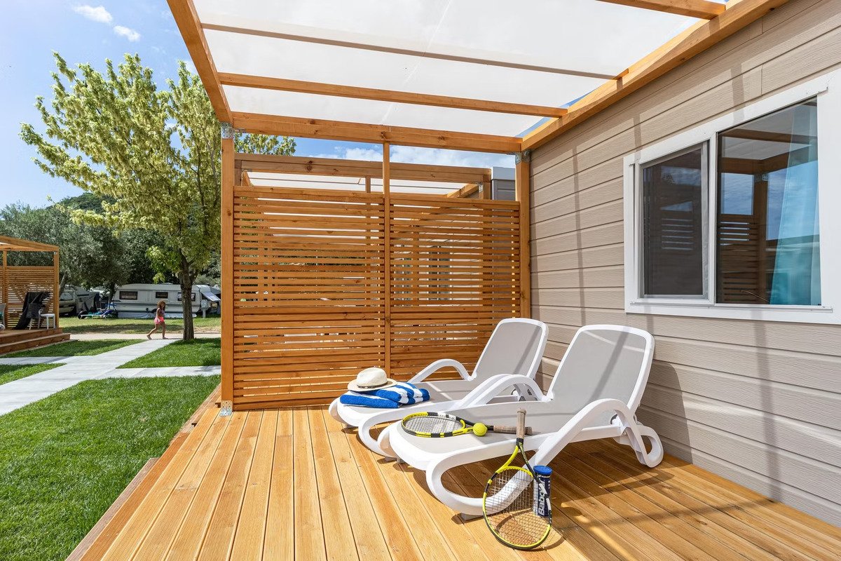 Mobilní domky standard 4+0 - plocha cca 19 - 24 m2, mají dvě ložnice (každá se dvěma lůžky), vlastní soc. zařízení (koupelna, WC), denní pokoj s vybaveným kuchyňským koutem a venkovní terasu k posezení. Dále je domek vybaven TV, klimatizací a Wi-Fi. Mobilní domky Comfort 4+1 - mají dvě ložnice (manželská postel/oddělená lůžka), vlastní soc. zařízení (koupelna, WC), denní pokoj s vybaveným kuchyňským koutem a venkovní terasu k posezení. Dále je domek vybaven TV, klimatizací a Wi-Fi. Mobilní domky Premium 4+0 - mají dvě ložnice (manželská postel/oddělená lůžka), vlastní soc. zařízení (koupelna, WC), denní pokoj s pohovkou vybaveným kuchyňským koutem a také venkovní terasu k posezení. Dále je domek vybaven TV, klimatizací a Wi-Fi.Ložní prádlo je v ceně, pronájem ručníků je možný za 10 EUR (jedna výměna pro celý domek). Výměna ložního prádla včetně ručníků je možná za 15 EUR.