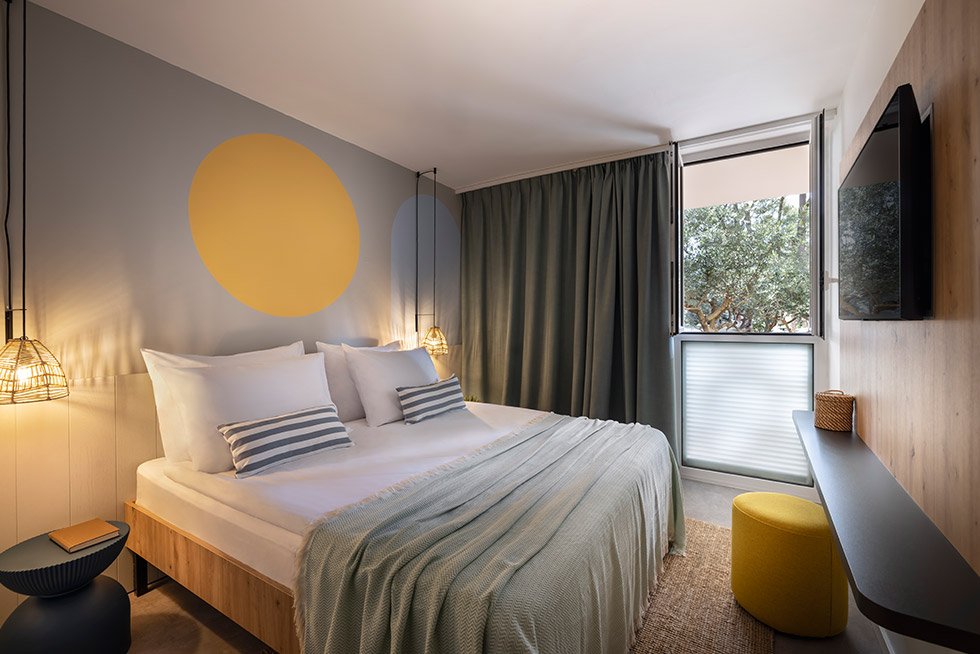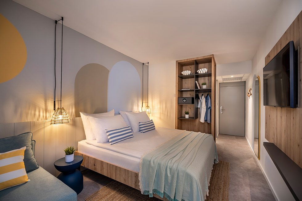 Rekonstruované pokoje v celém rozšířeném areálu. Klimatizované dvoulůžkové pokoje Standard (2+0, 2+1) s možností přistýlky a vlastním soc.zařízením (koupelna, fén, WC). Dále jsou pokoje vybaveny TV, telefonem, trezorem a Wi-Fi. Většina pokojů má balkon. Za příplatek k dispozici:Pokoje s výhledem na mořePokoje Superior Pokoje Superiror s výhledem na moře