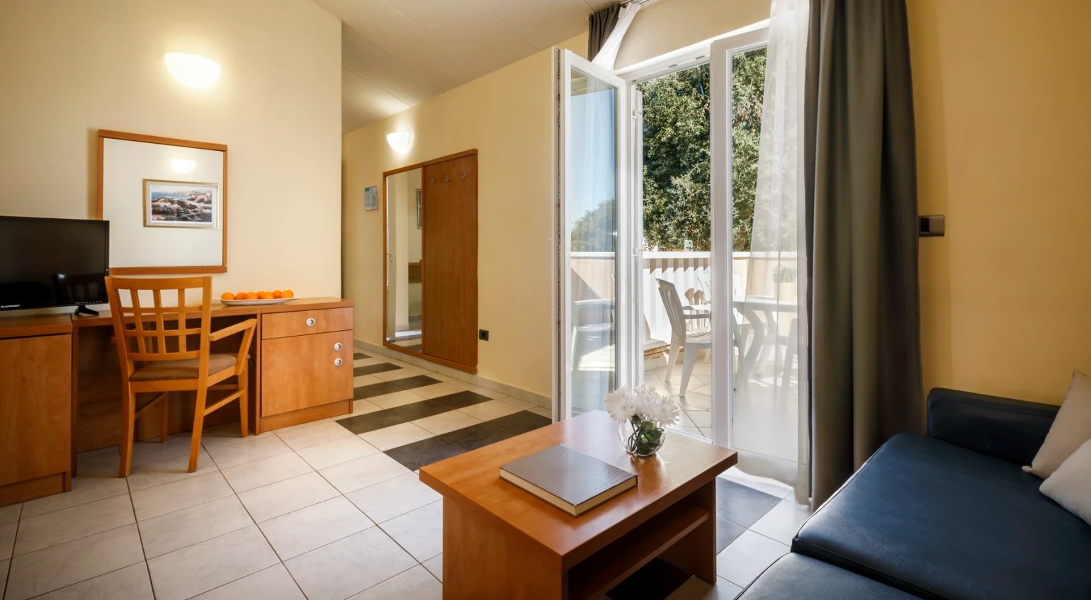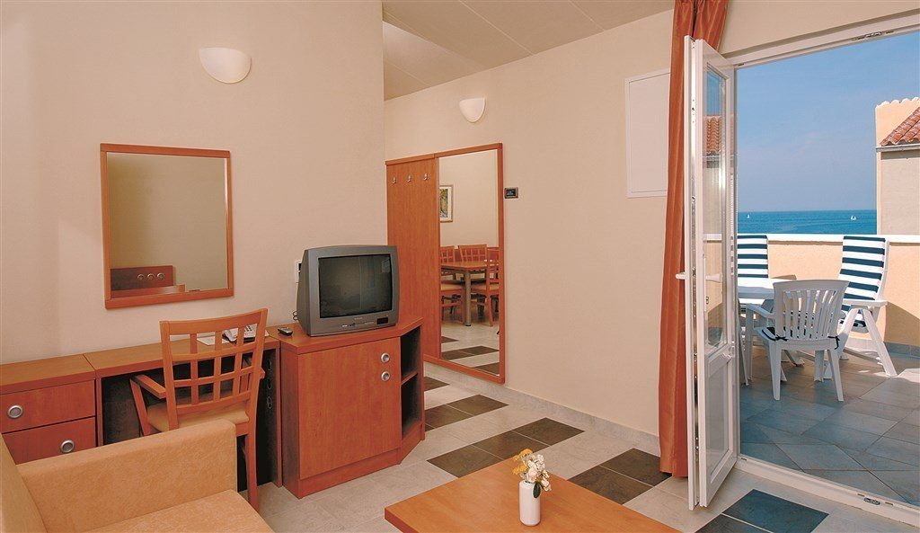 Studio pro 3 osoby: denní místnost s manželským lůžkem a rozkládacím křeslem. Apartmán pro 3-4 osoby: ložnice se 2 lůžky a denní pokoj s 1-2 lůžky (rozkládací gauč). Max. obsazenost: 3 dospělí nebo 2 dospělí + 2 děti Apartmán pro 5-6 osob: 2 ložnice (každá má 2 lůžka), denní pokoj s 1-2 lůžky (rozkládací gauč). Max. obsazenost: 5 dospělých nebo 4 dospělí + 2 dětiApartmány jsou disponují kuchyňským koutem vybaveným pro základní vaření, chladničkou, klimatizací, TV/sat., telefonem a balkonem nebo terasou.