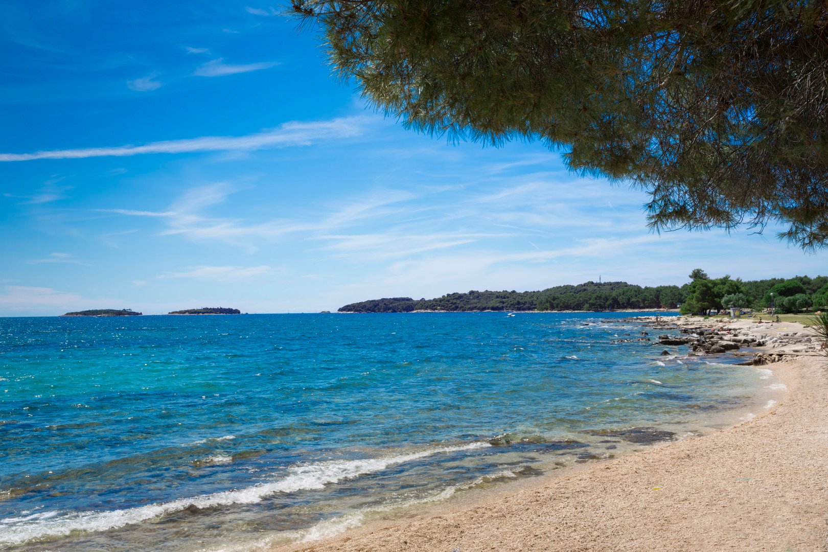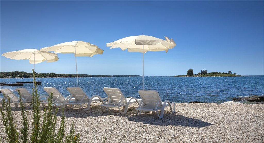 Kompletně vybavený resort, zastíněný borovicemi a olivovníky, leží přímo na pláži asi 3 km jižně od centra Rovinje.