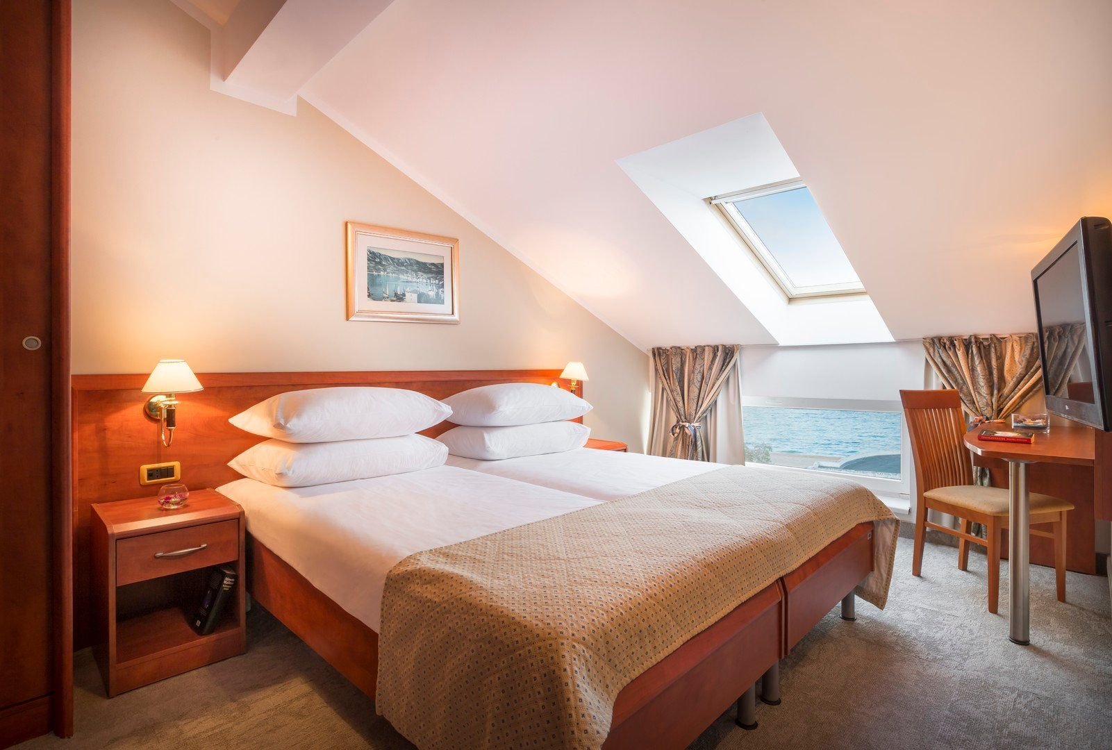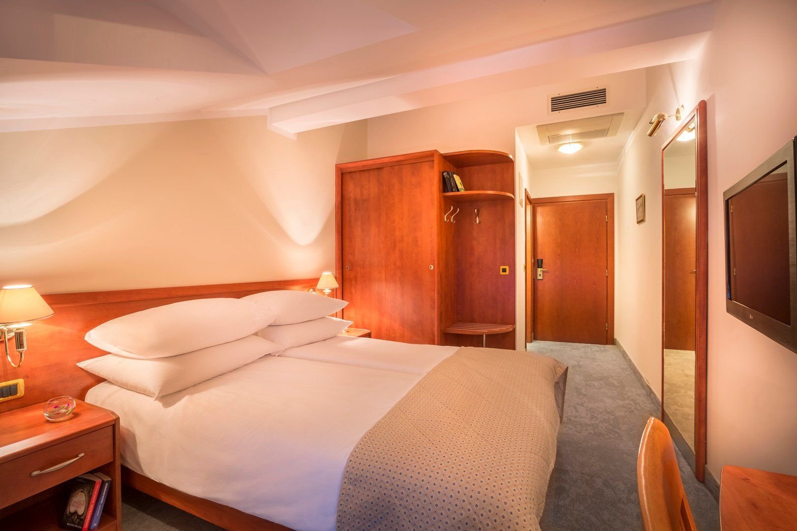 Dvoulůžkové pokoje s možností přistýlky jsou vybaveny vlastním příslušenstvím (koupelna, vysoušeč vlasů, WC), klimatizací, TV/sat., telefonem, trezorem a balkonem; za poplatek minibar.