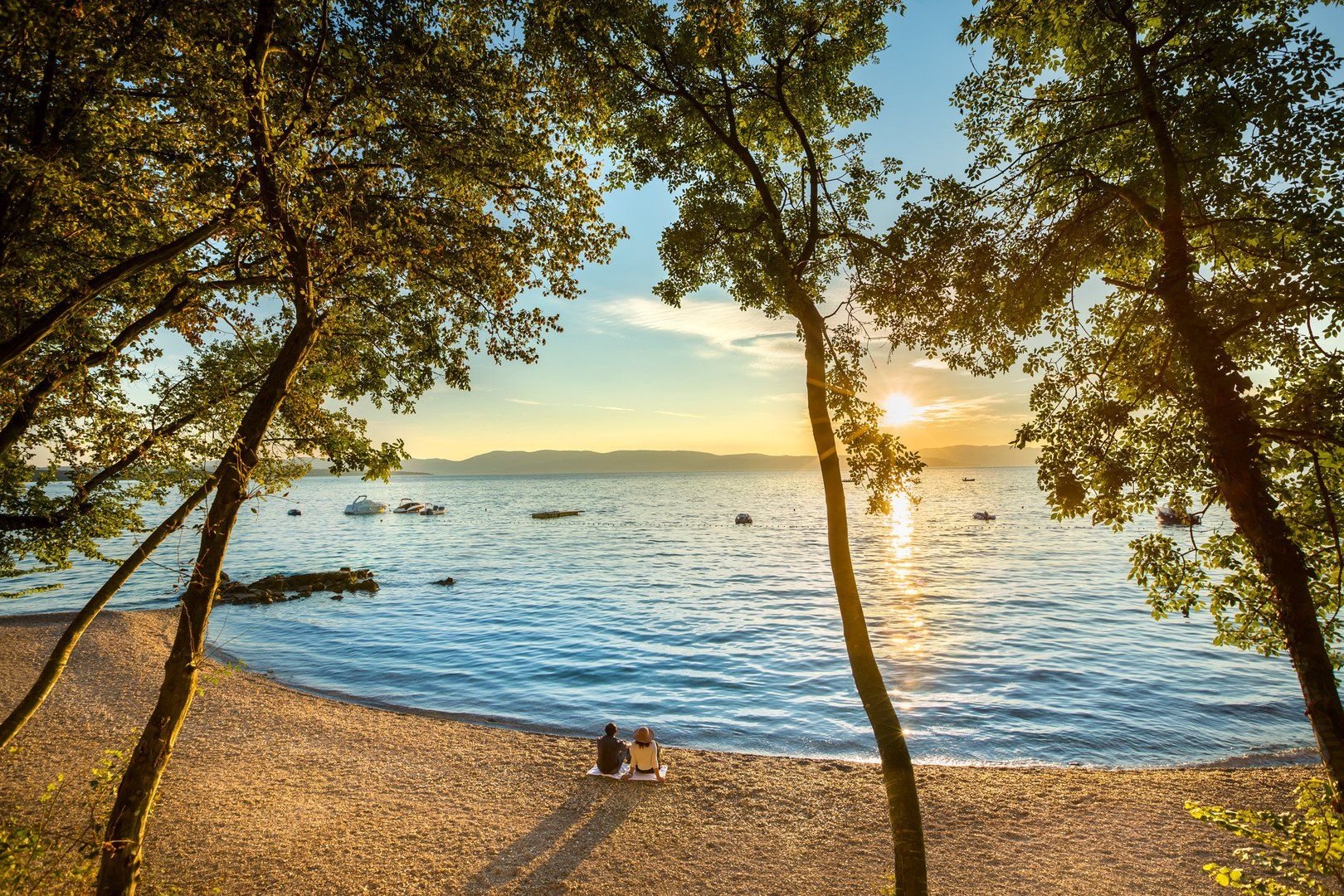 Upravená pláž s lehátky i menší oblázková pláž se nachází přímo před hotelem. Další, různě velké kamenité pláže s upravenými místy na slunění v okolí. Pláže jsou podél promenády vybaveny sprchami. Na okraji městečka je neoficiální nudistická pláž.