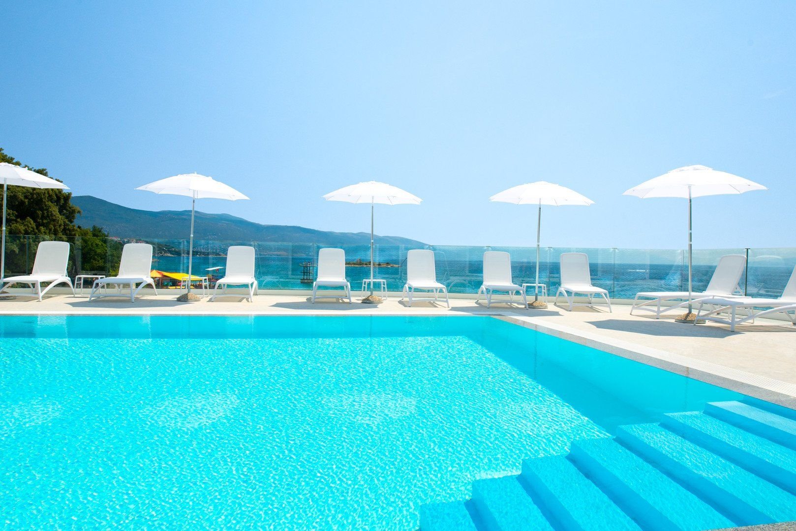 Hotel se nachází pár kroků od oblázkové, částečně písečné pláže. Plata na slunění.