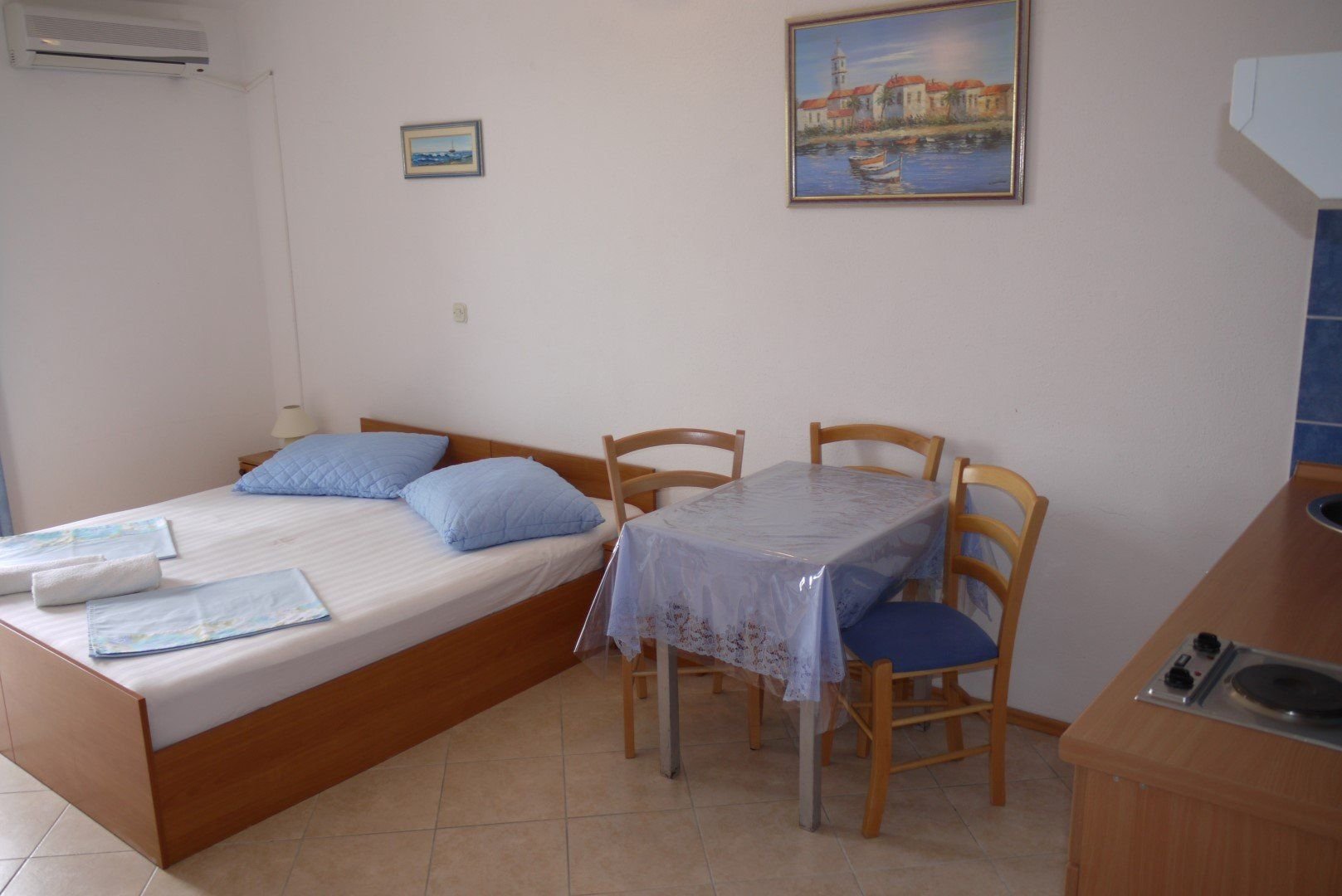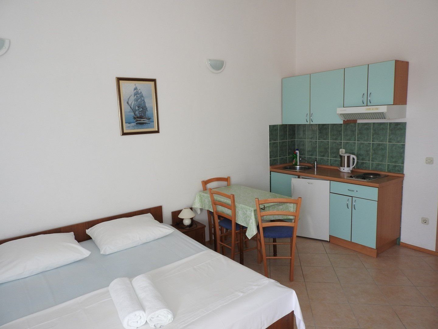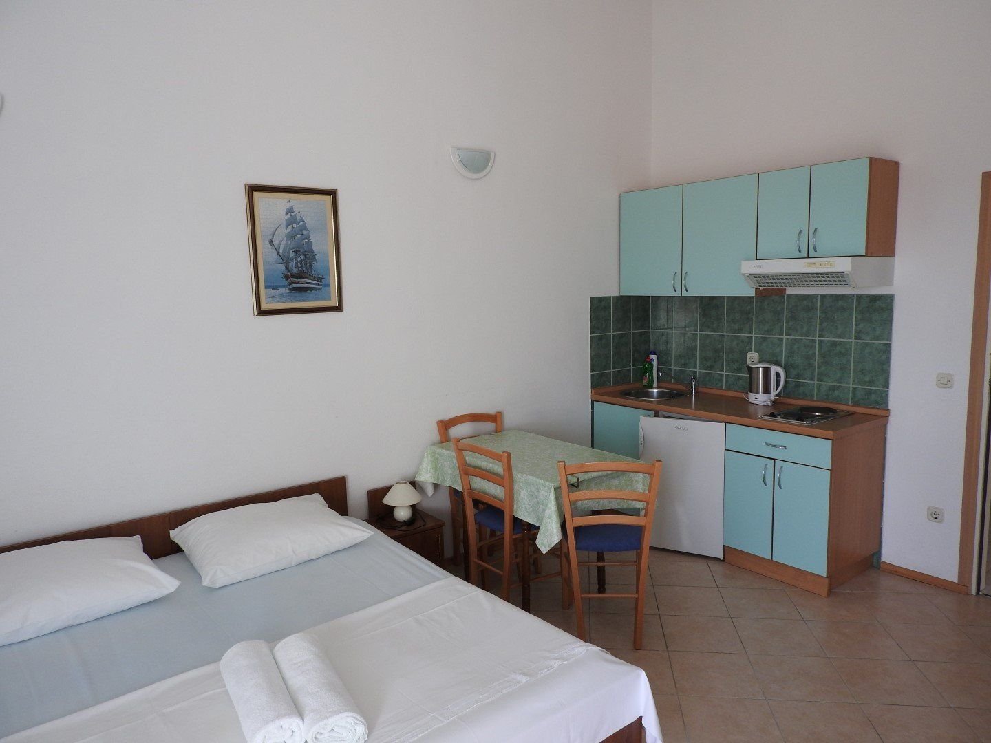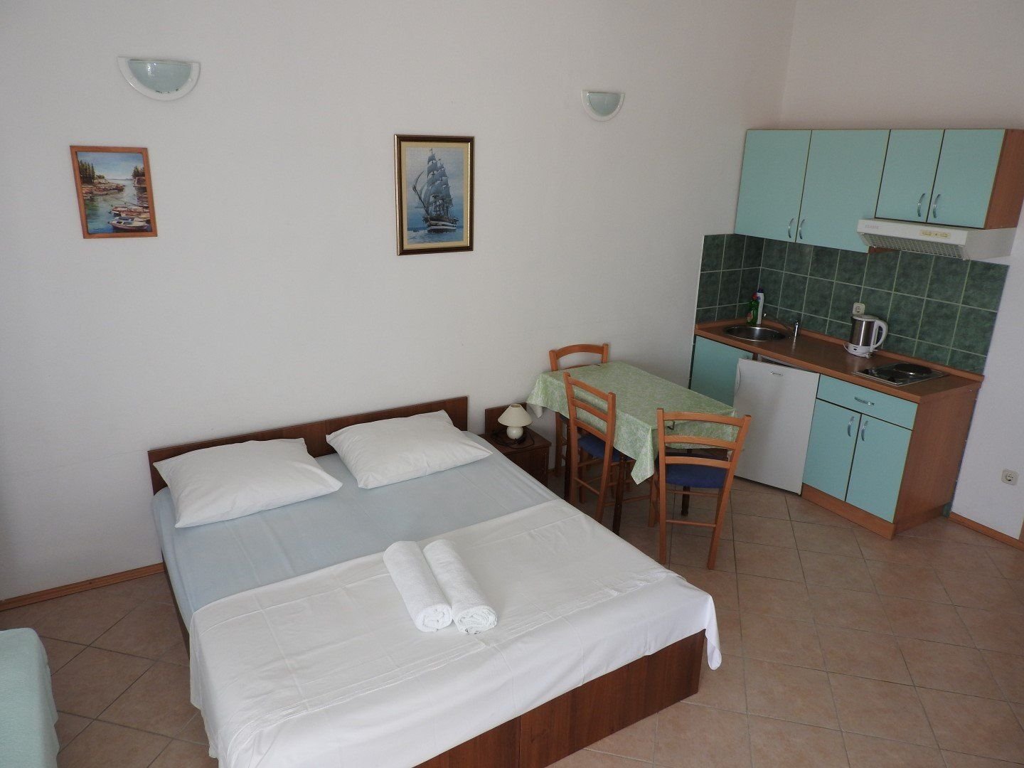 Ubytování ve studiích pro 2-3 osoby. Studia se nacházejí v 1. nebo 2. patře. Každé studio má manželské lůžko a případně lůžko pro 3. a 4. osobu, vlastní koupelnu se sprchou, WC, soukromý balkon nebo terasu s posezením, vybavený kuchyňský kout s chladničkou, který je umístěn buď přímo ve studiu či na soukromé terase, klimatizace.