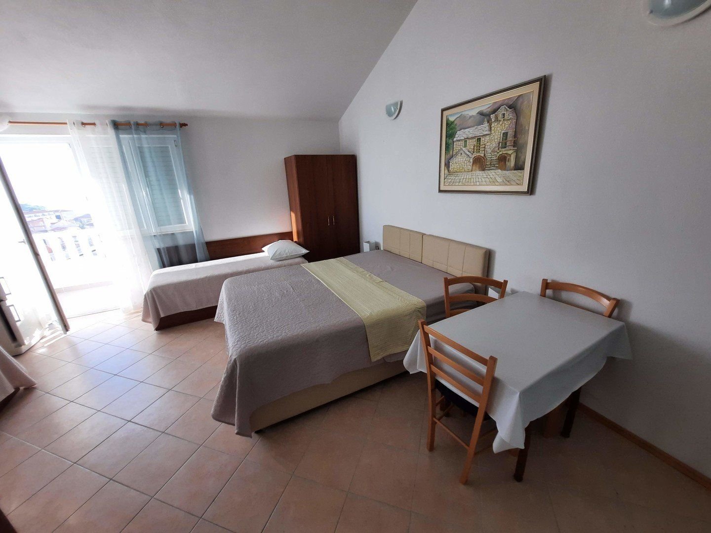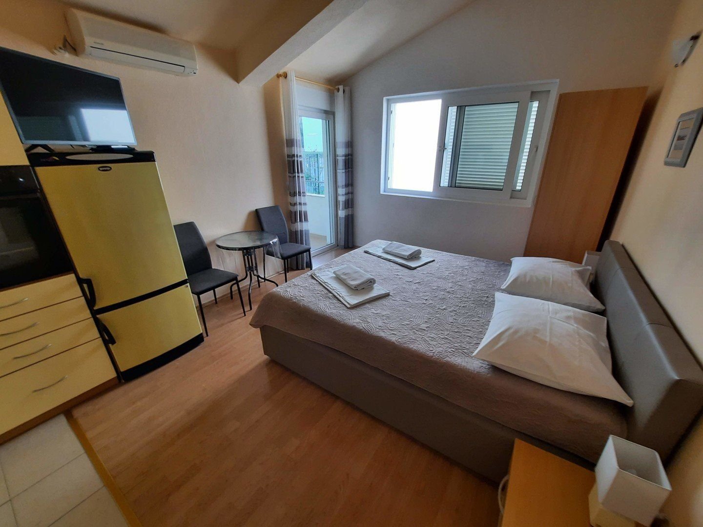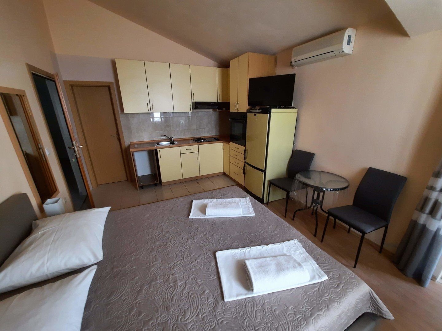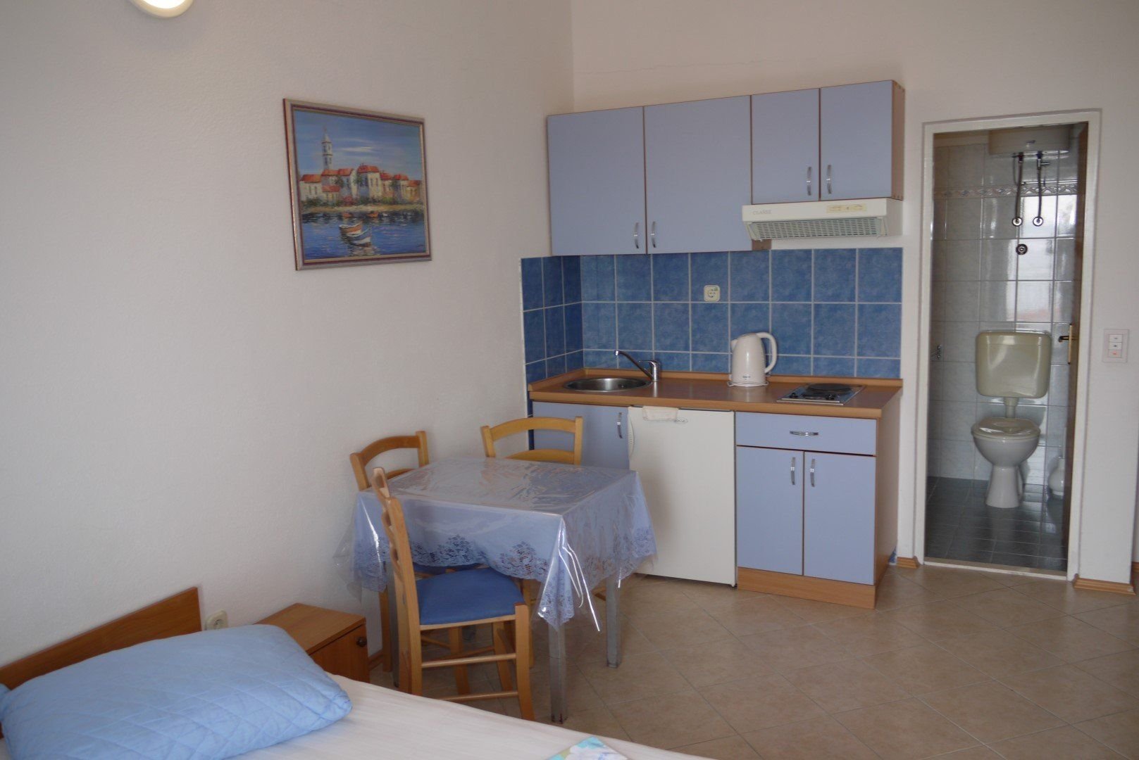 Ubytování ve studiích pro 2-3 osoby. Studia se nacházejí v 1. nebo 2. patře. Každé studio má manželské lůžko a případně lůžko pro 3. a 4. osobu, vlastní koupelnu se sprchou, WC, soukromý balkon nebo terasu s posezením, vybavený kuchyňský kout s chladničkou, který je umístěn buď přímo ve studiu či na soukromé terase, klimatizace.