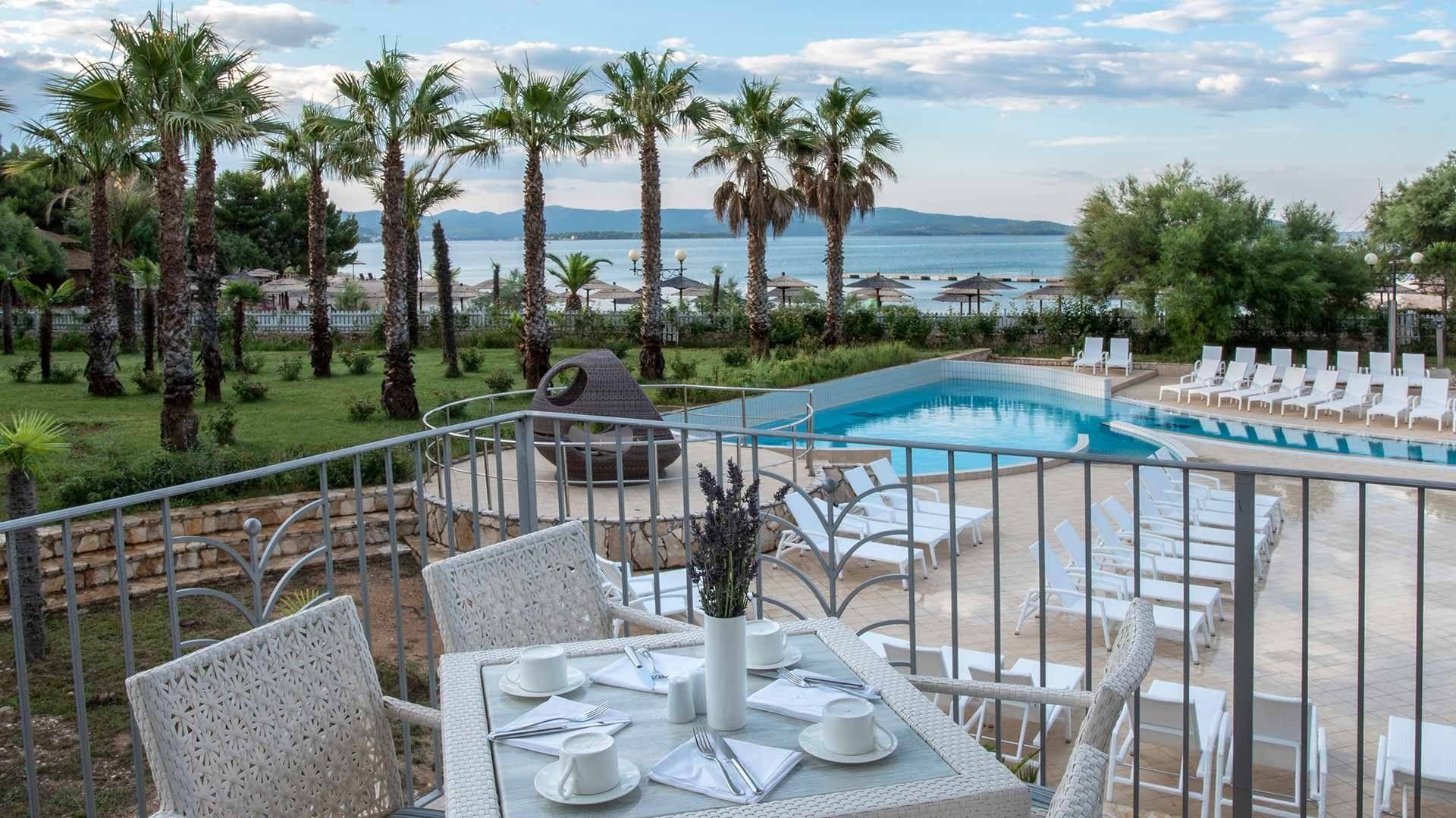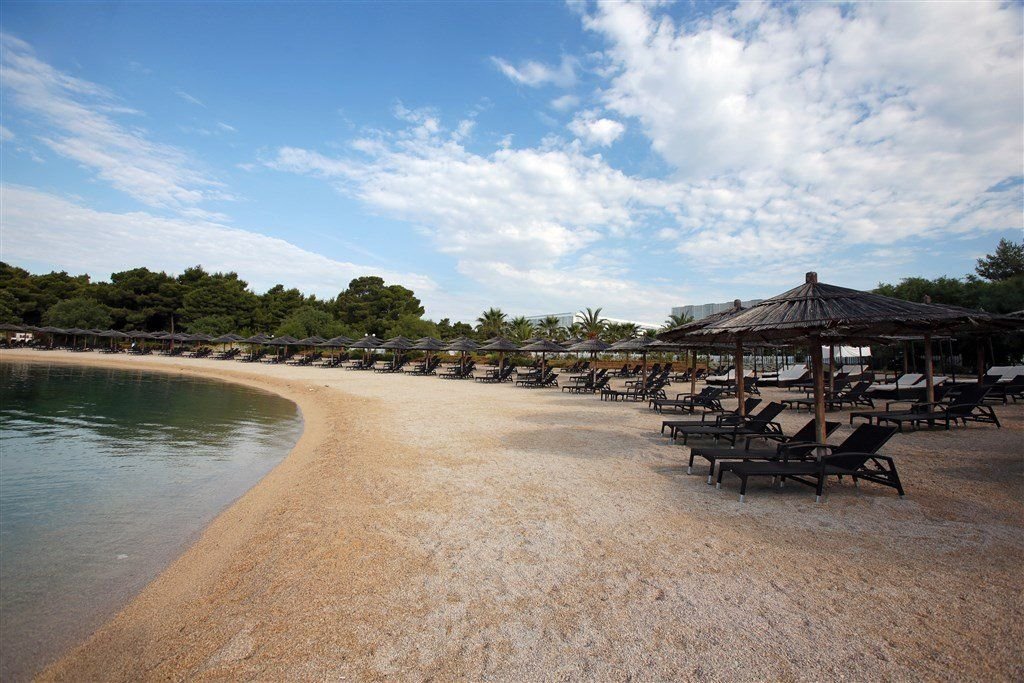 Oblázková pláž proložená betonovými platy a s pozvolným vstupem do moře je vzdálena cca 50 m od hotelu. Možnost využití i ostatních pláží v areálu.