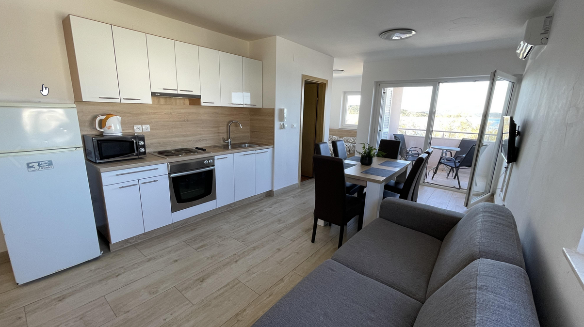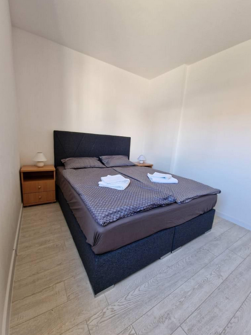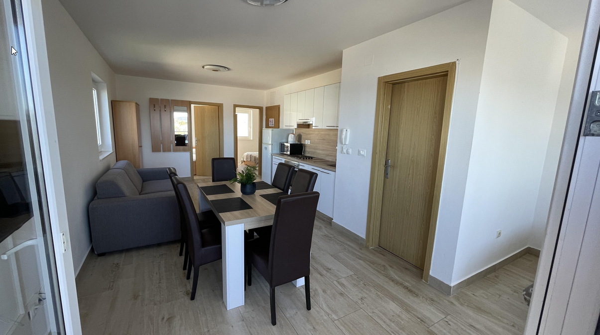 Parkování (zdarma), 2x grill s posezením, moderně vybavené apartmány s klimatizací, kompletně vybavenou kuchyňkou s chladničkou, mikrovnnou troubou a rychlovarnou konvicí, Wi-Fi připojení