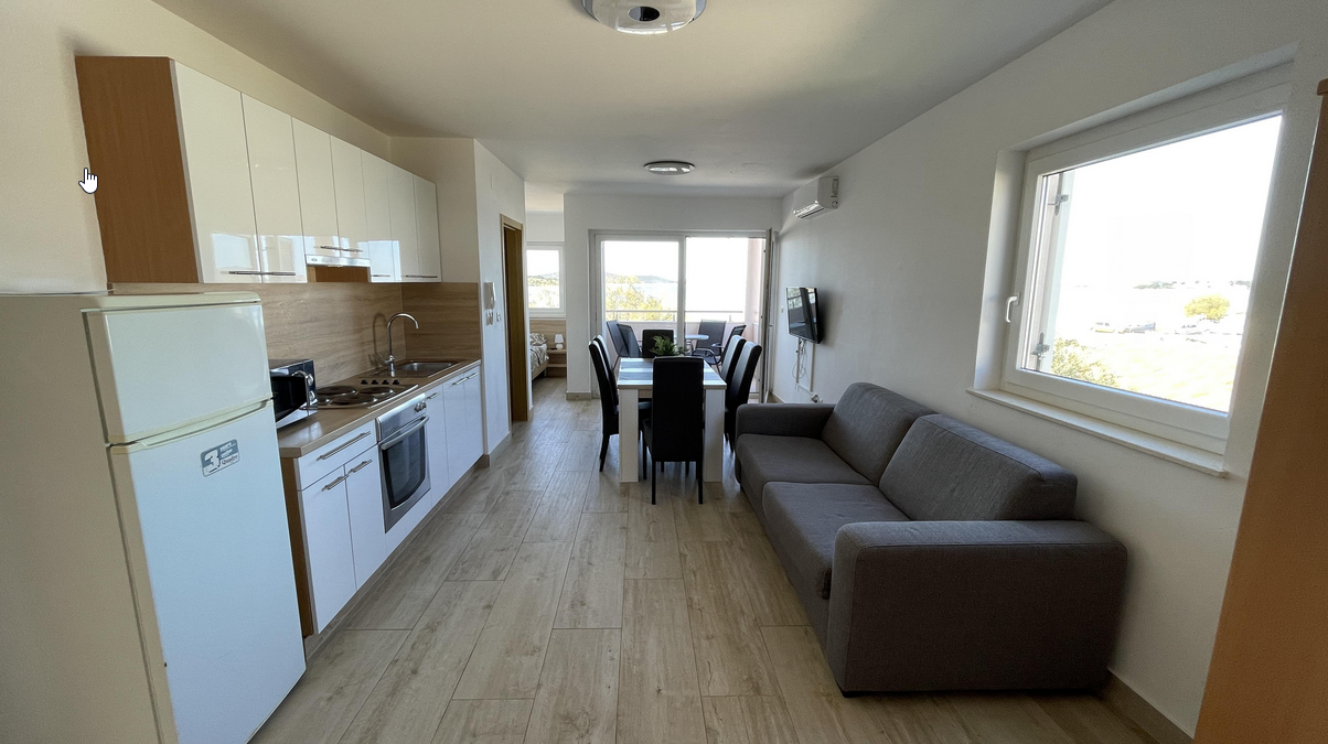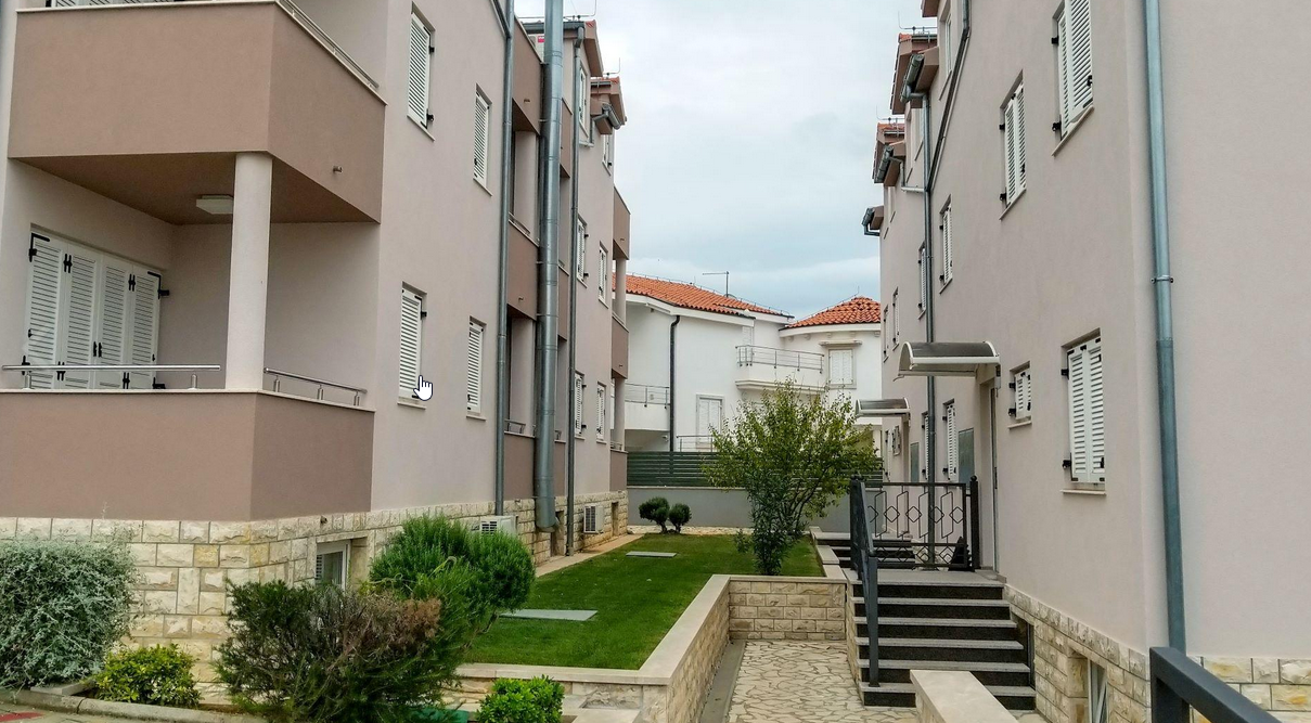 Apartmány se nacházejí přímo u pláže v letovisku Srima. Jedná se o sesterské apartmány k apartmánům Dalmacija, které jsou vzdáleny 150 m. Od pláže je dělí pouze pobřežní promenáda. V okolí apartmánů je řada restaurací, stánků se zmrzlinou, kafebarů. Komplex se skládá ze dvou za sebou stojících budov.