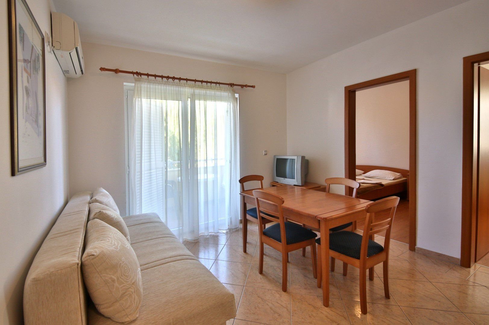 Apartmány 1/6 pro 4-6 osob mají 2 oddělené dvoulůžkové ložnice, obývací pokoj s jídelním koutem a rozkládacím lůžkem pro 2 děti a vybavenou kuchyňku s mikrovlnnou troubou a lednicí, jsou vybaveny vlastním příslušenstvím (koupelna, WC), TV a balkonem; klimatizace zdarma. Apartmány 1/4, apartmány pro 2 až 4 osoby – jedna ložnice s manželským lůžkem a větracím oknem, prostorný obývací pokoj s rozkládací pohovkou pro 2 osoby (pouze pro děti do 12 let) a s vchodem na balkón, koupelna se sprchou a WC, vybavený kuchyňský kout, jídelní stůl. Tyto apartmány nemají ani boční výhled na moře a jsou pouze v budově B.