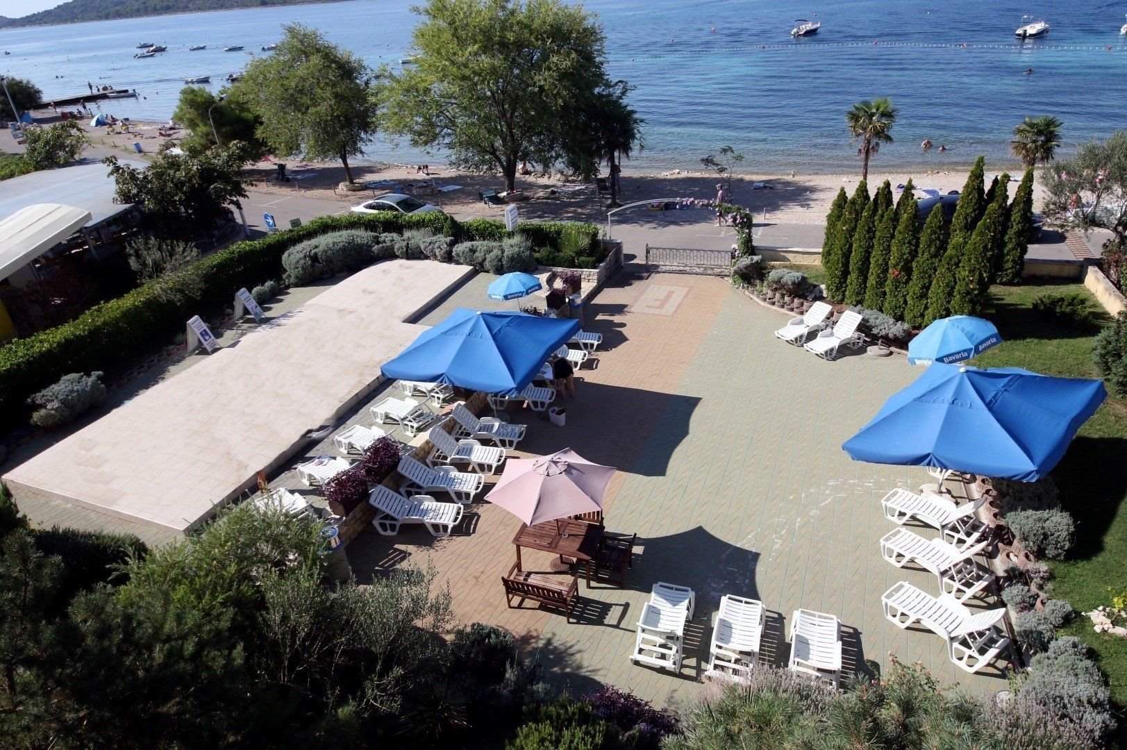 Oblázková pláž s pozvolným vstupem do moře se nachází přímo před hotelem a je oddělena pouze pobřežní promenádou.
