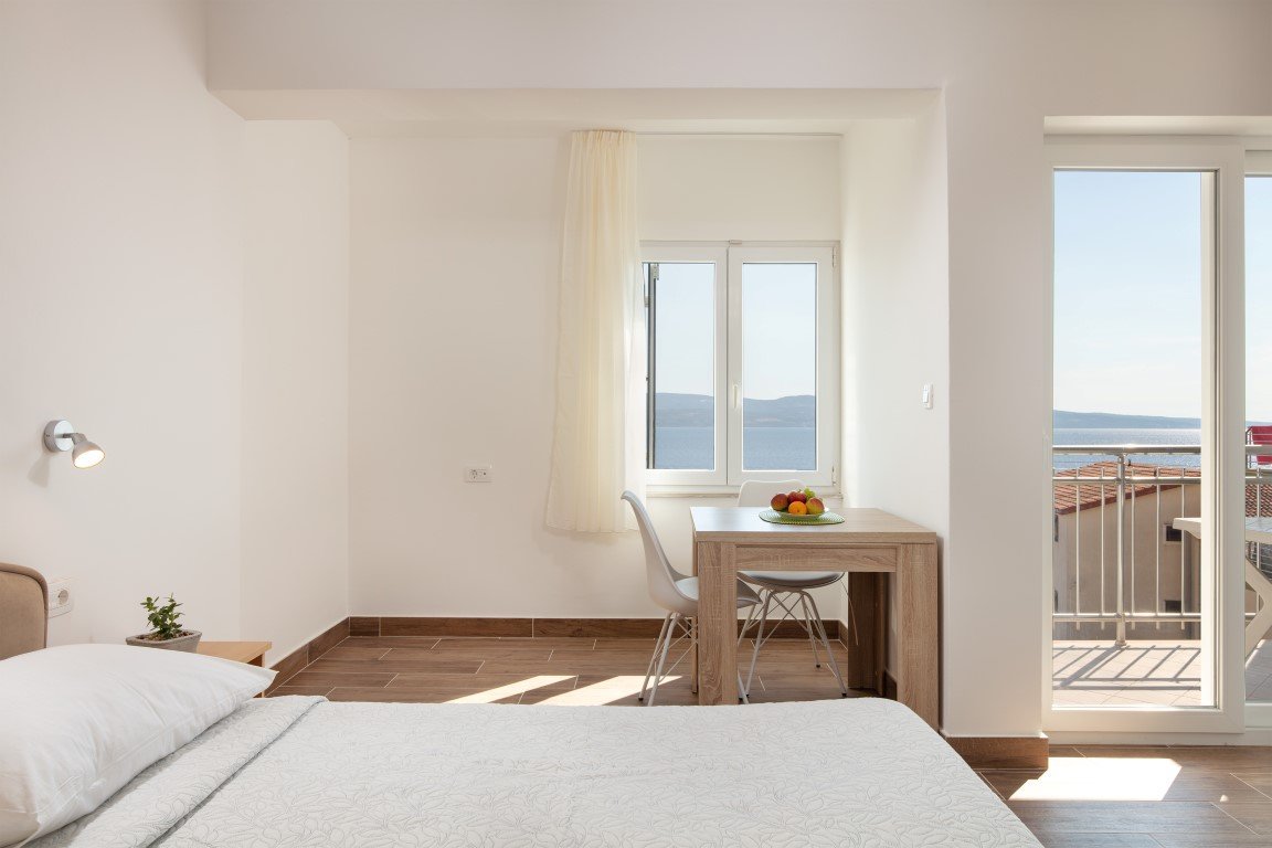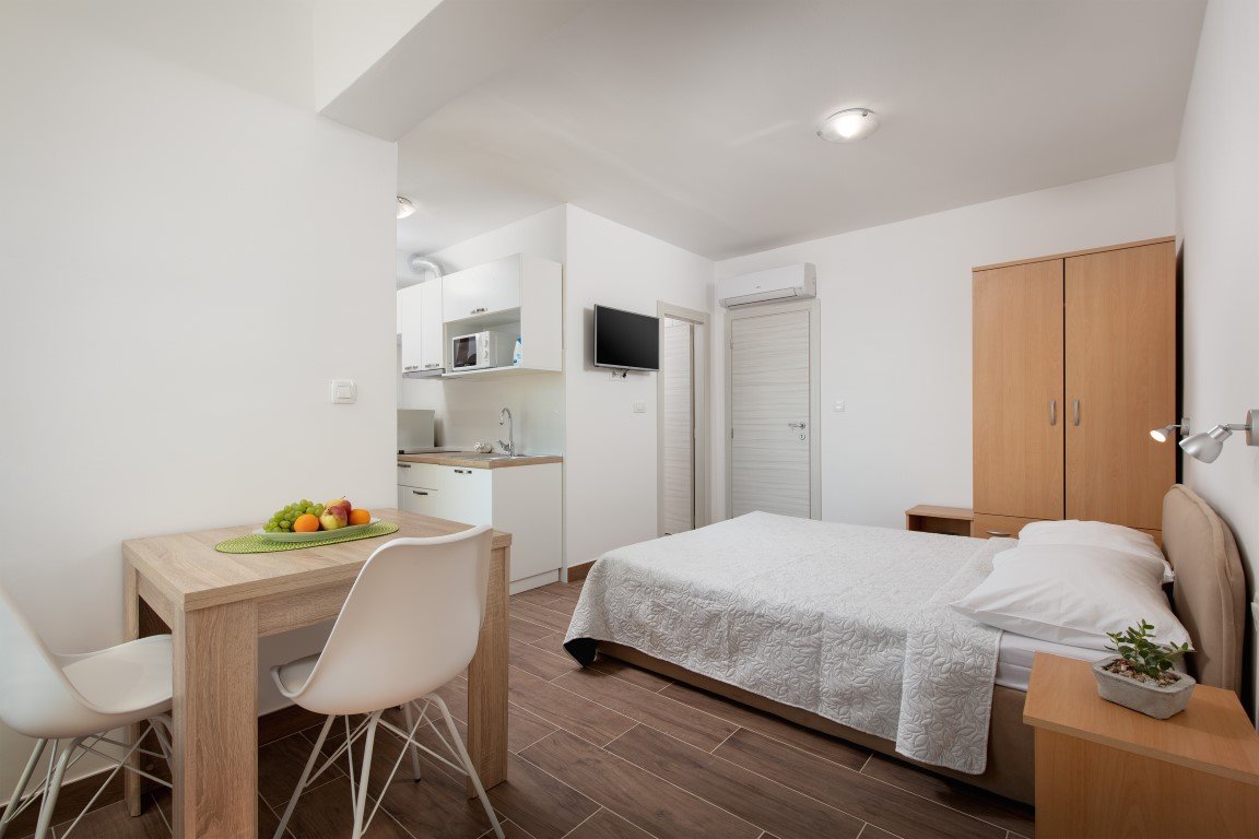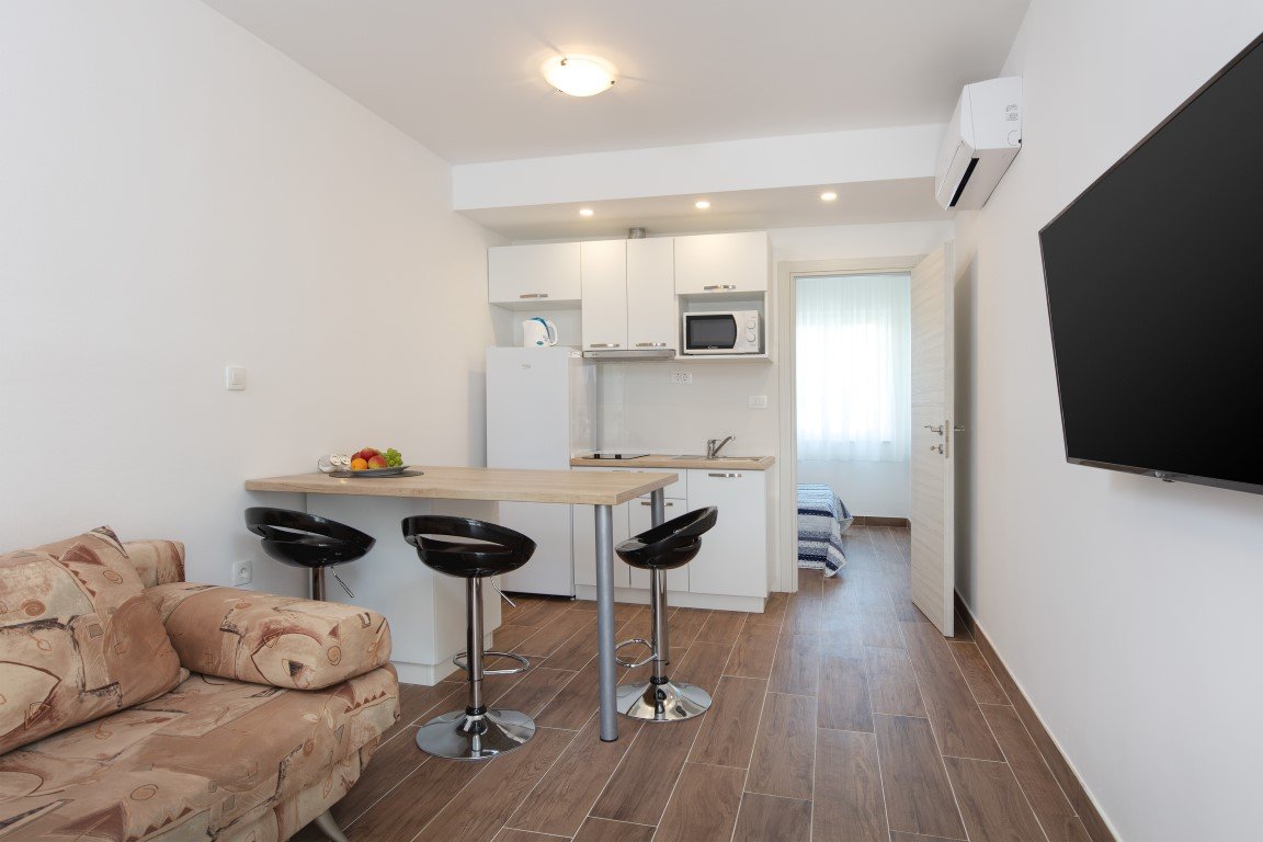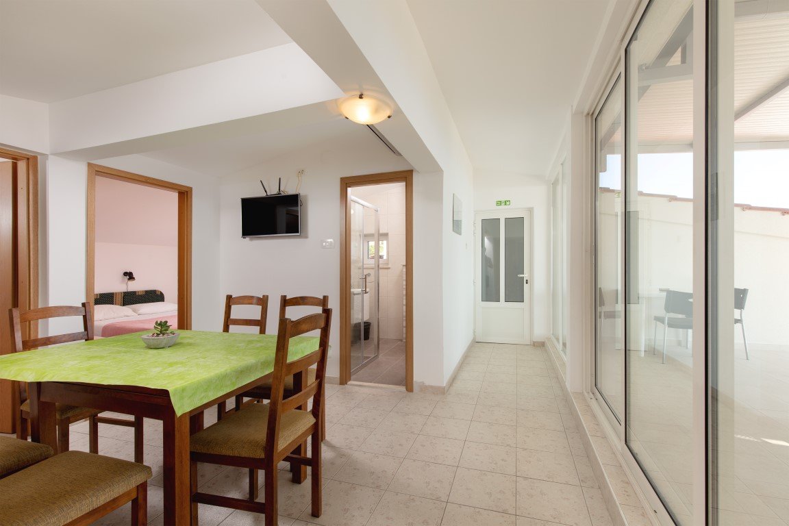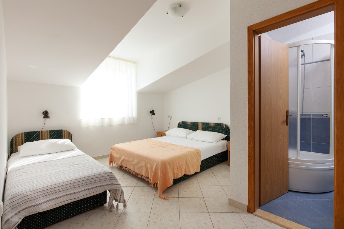 Studio S2+1 s čelním výhledem na moře - jednopokojový apartmán s manželským lůžkem a s možností rozkládací přistýlky pro dítě max do 15 let (za poplatek), vybavený kuchyňský koutek s chladničkou, koupelna se sprchou a WC, SAT/TV, klimatizace, balkón s posezením a s přímým výhledem na moře. Apartmán A2+2 pro 4 osoby s čelním výhledem na moře (na vyžádání) – oddělená ložnice s manželským lůžkem, denní místnost s rozkládací pohovkou až pro 2 osoby, vybavená kuchyňka s chladničkou, koupelna se sprchou, WC, klimatizace, balkón, SAT/TV. Apartmán A2+2 pro 4 osoby s bočním výhledem na moře – u tohoto apartmánu se z chodby vchází přímo do 2-lůžkové ložnice s manželským lůžkem odkud se pak dostanete do obývacího pokoje s kompletně vybavenou kuchyňkou a rozkládacím gaučem až pro 2 osoby, SAT/TV, klimatizace. Vchod na balkón s částečným bočním výhledem na moře je z obývacího pokoje. Z ložnice je pak vstup do koupelny se sprchou a WC.Apartmán pro 7 osob - velmi prostorný střešní apartmán zabírá celé 3. patro domu a má s terasou rozlohu přes 100m2. Skládá se z 3 oddělených ložnic (1x pro 2 osoby, 2x pro 3 osoby), obývacího pokoje s vybavenou kuchyňkou,jídelním stolem, SAT/TV, koupelna se sprchou a WC a navíc jeden z pokojů pro 3 osoby má další koupelnu se sprchou a WC. Hlavní přednos apartmánu je prostorná krytá terasa s nádherným výhledem na moře. Na terase je možnostposezení. Od obývacího pokoje je terasa oddělena prosklenou odsouvací stěnou.