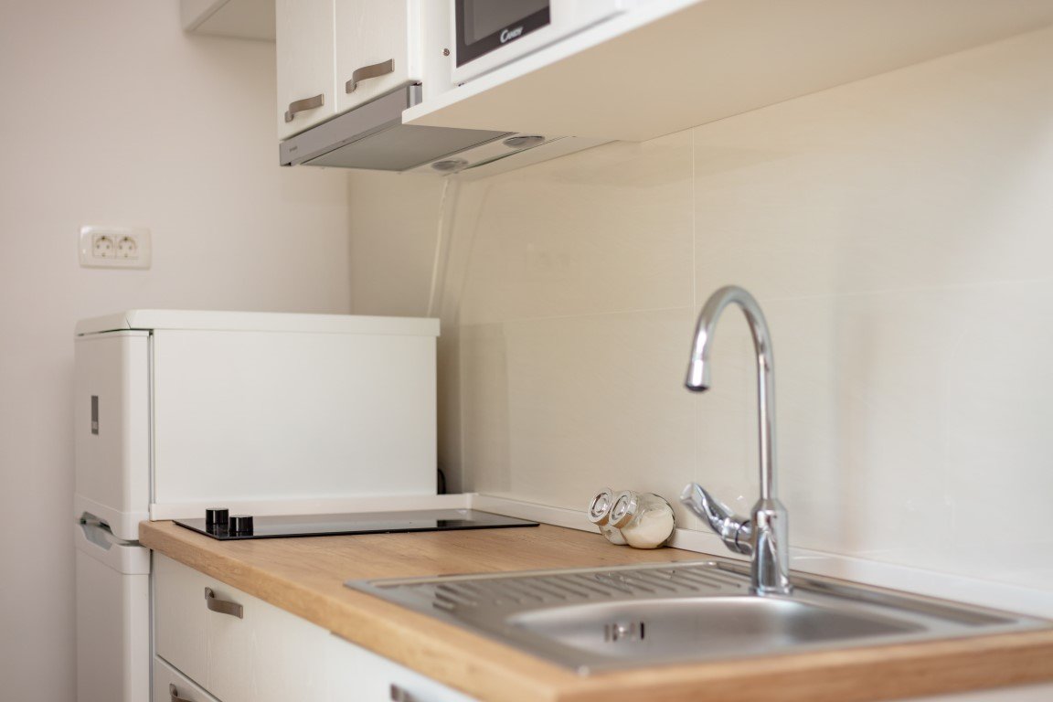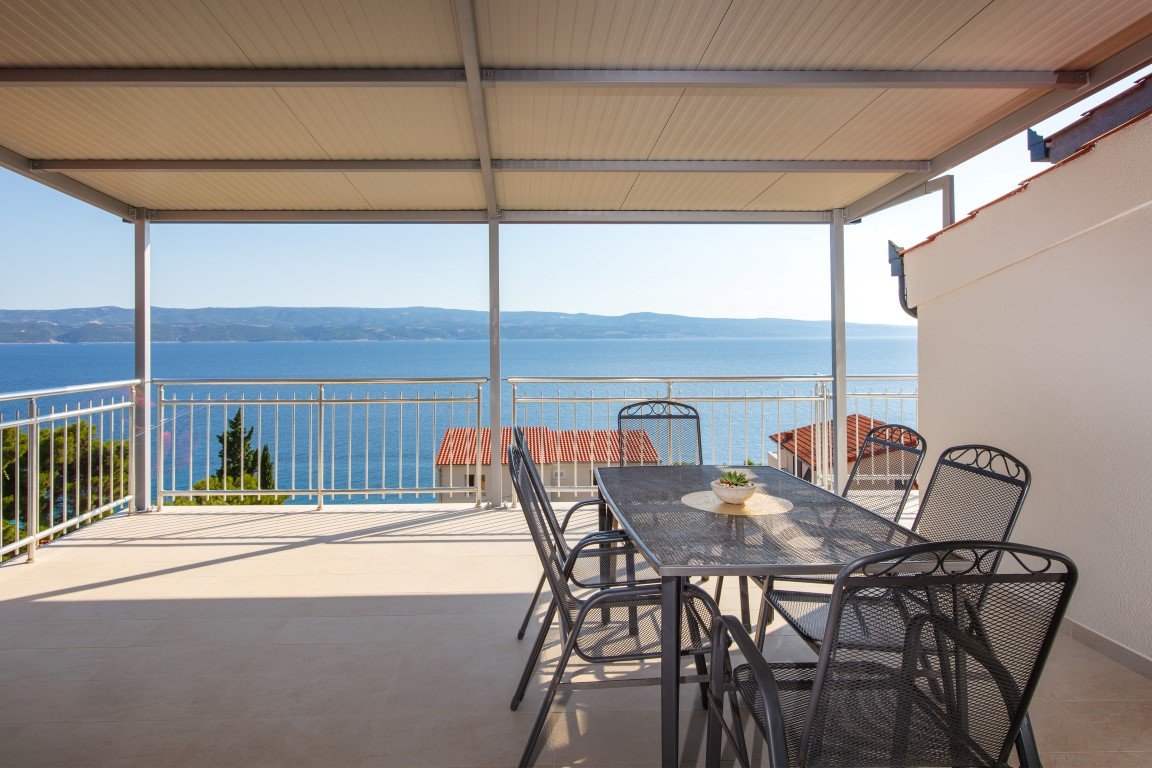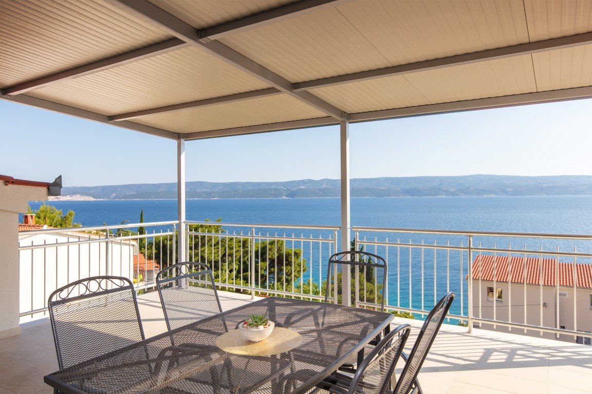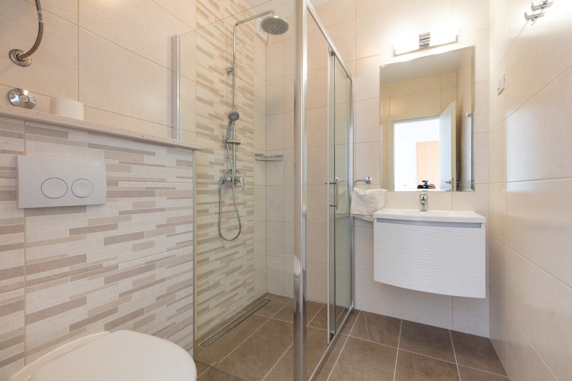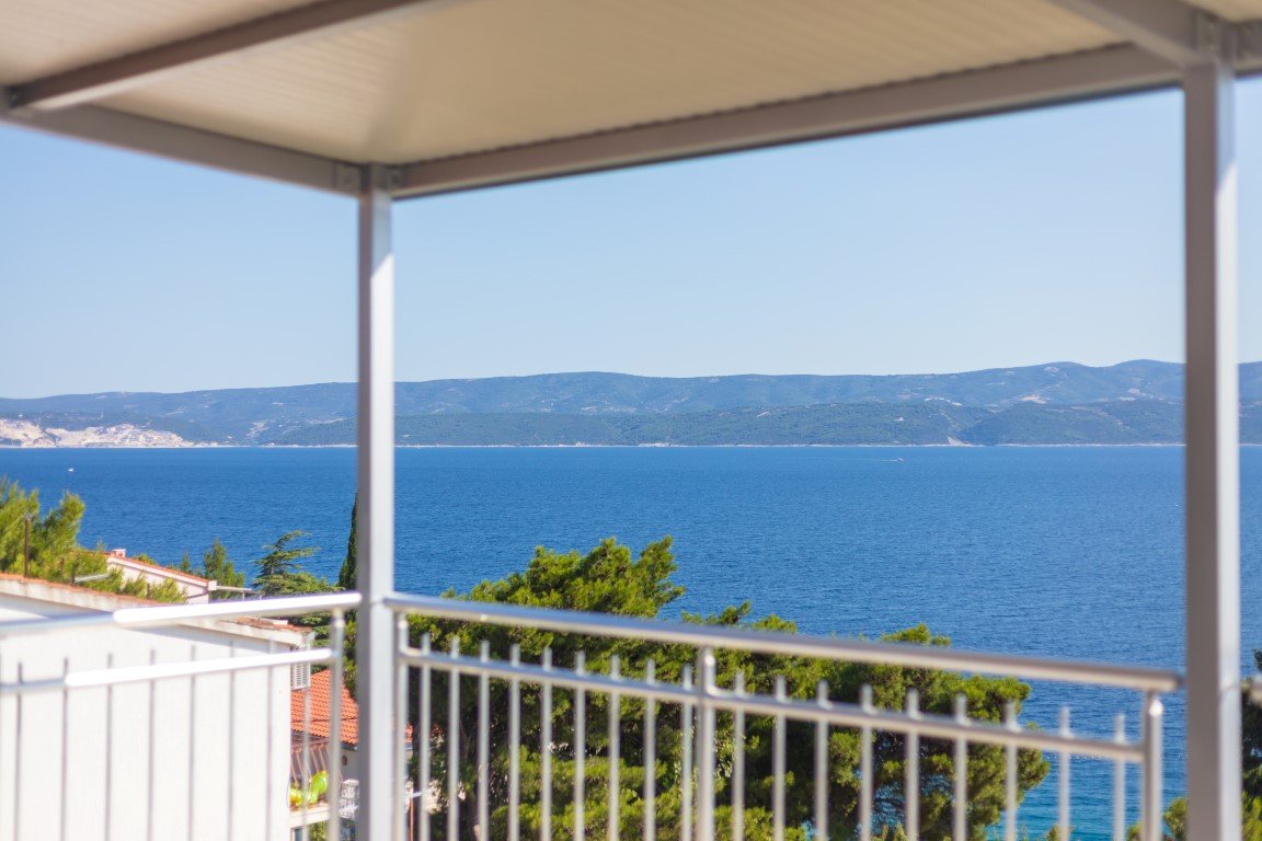 Studio S2+1 s čelním výhledem na moře - jednopokojový apartmán s manželským lůžkem a s možností rozkládací přistýlky pro dítě max do 15 let (za poplatek), vybavený kuchyňský koutek s chladničkou, koupelna se sprchou a WC, SAT/TV, klimatizace, balkón s posezením a s přímým výhledem na moře. Apartmán A2+2 pro 4 osoby s čelním výhledem na moře (na vyžádání) – oddělená ložnice s manželským lůžkem, denní místnost s rozkládací pohovkou až pro 2 osoby, vybavená kuchyňka s chladničkou, koupelna se sprchou, WC, klimatizace, balkón, SAT/TV. Apartmán A2+2 pro 4 osoby s bočním výhledem na moře – u tohoto apartmánu se z chodby vchází přímo do 2-lůžkové ložnice s manželským lůžkem odkud se pak dostanete do obývacího pokoje s kompletně vybavenou kuchyňkou a rozkládacím gaučem až pro 2 osoby, SAT/TV, klimatizace. Vchod na balkón s částečným bočním výhledem na moře je z obývacího pokoje. Z ložnice je pak vstup do koupelny se sprchou a WC.Apartmán pro 7 osob - velmi prostorný střešní apartmán zabírá celé 3. patro domu a má s terasou rozlohu přes 100m2. Skládá se z 3 oddělených ložnic (1x pro 2 osoby, 2x pro 3 osoby), obývacího pokoje s vybavenou kuchyňkou,jídelním stolem, SAT/TV, koupelna se sprchou a WC a navíc jeden z pokojů pro 3 osoby má další koupelnu se sprchou a WC. Hlavní přednos apartmánu je prostorná krytá terasa s nádherným výhledem na moře. Na terase je možnostposezení. Od obývacího pokoje je terasa oddělena prosklenou odsouvací stěnou.