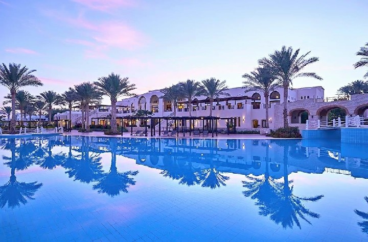 Hotel se nachází přímo u soukromé písčité pláže v zálivu Montazah.