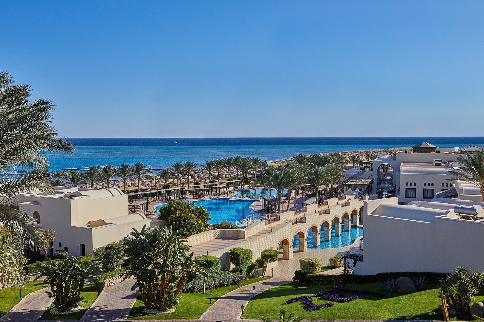 Hotel se nachází přímo u soukromé písčité pláže v zálivu Montazah.
