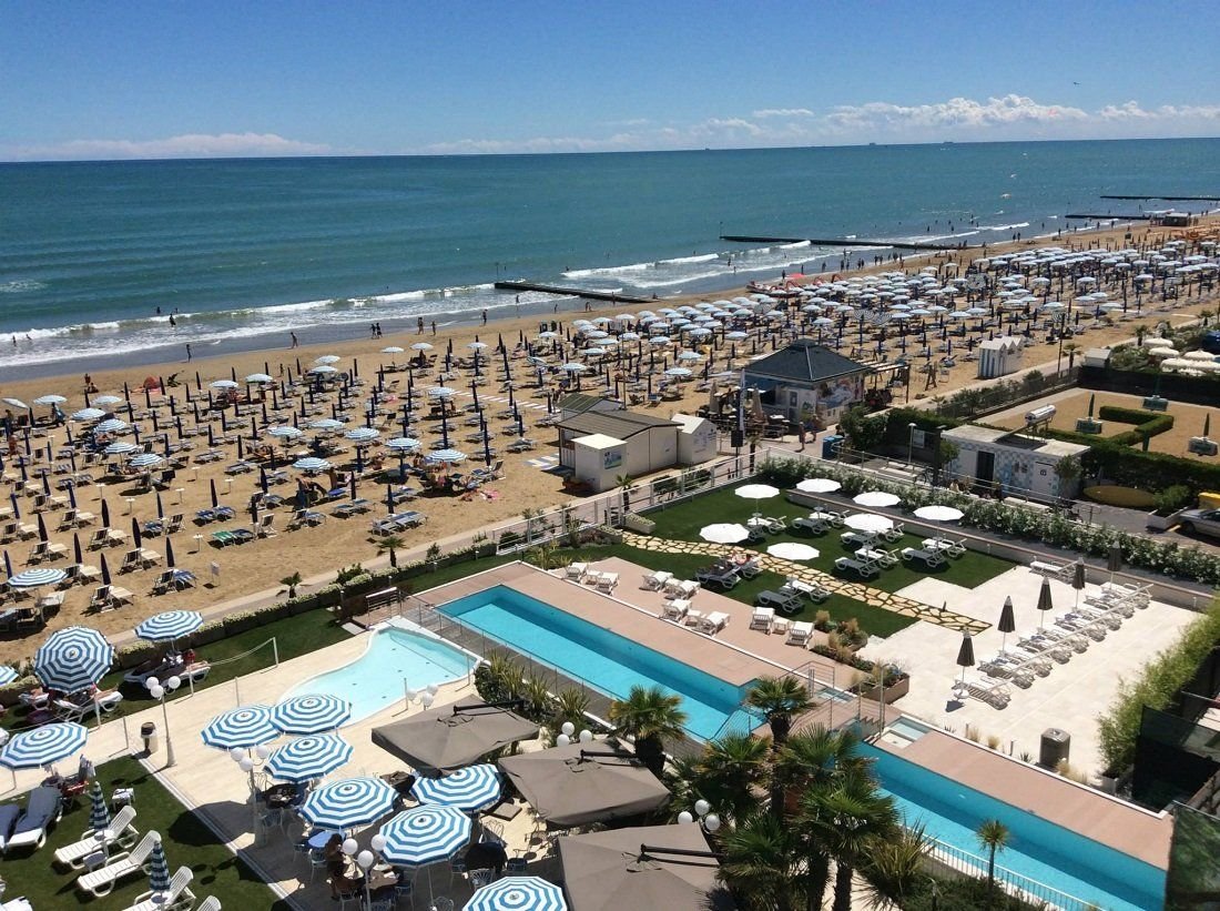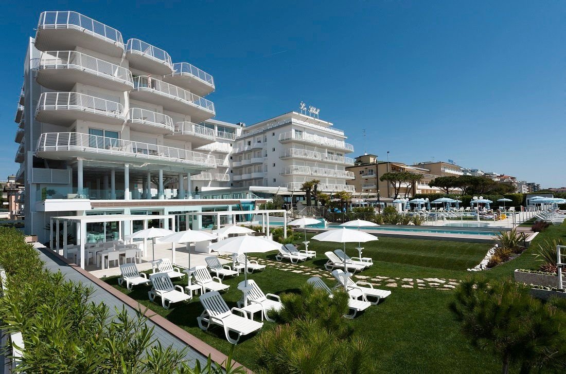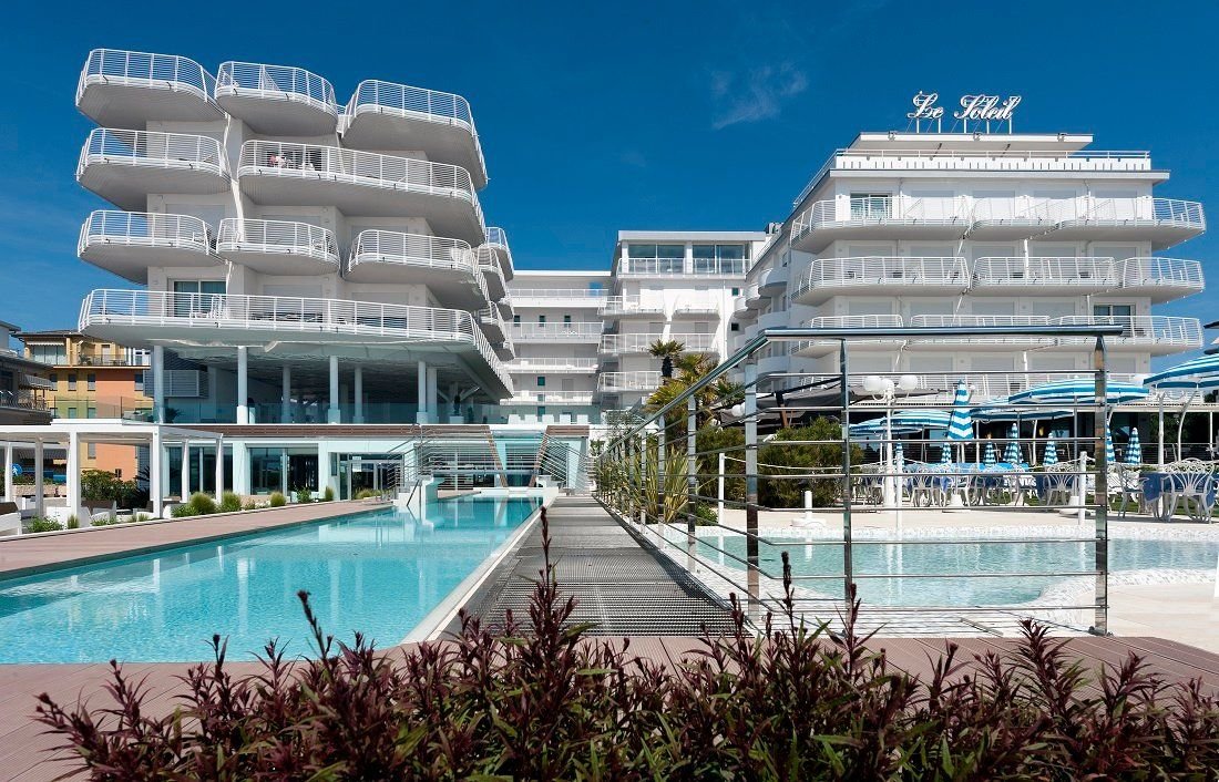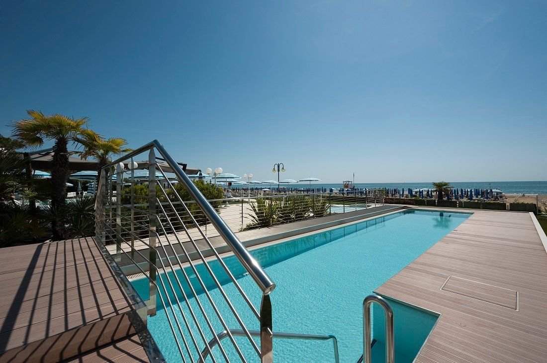 Luxusní hotel s bazénem v západní části letoviska, u náměstí Piazza Aurora. Přímo u pláže, aquapark Caribe bay se nachází cca 1 km od hotelu.