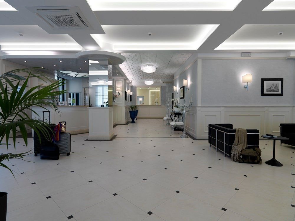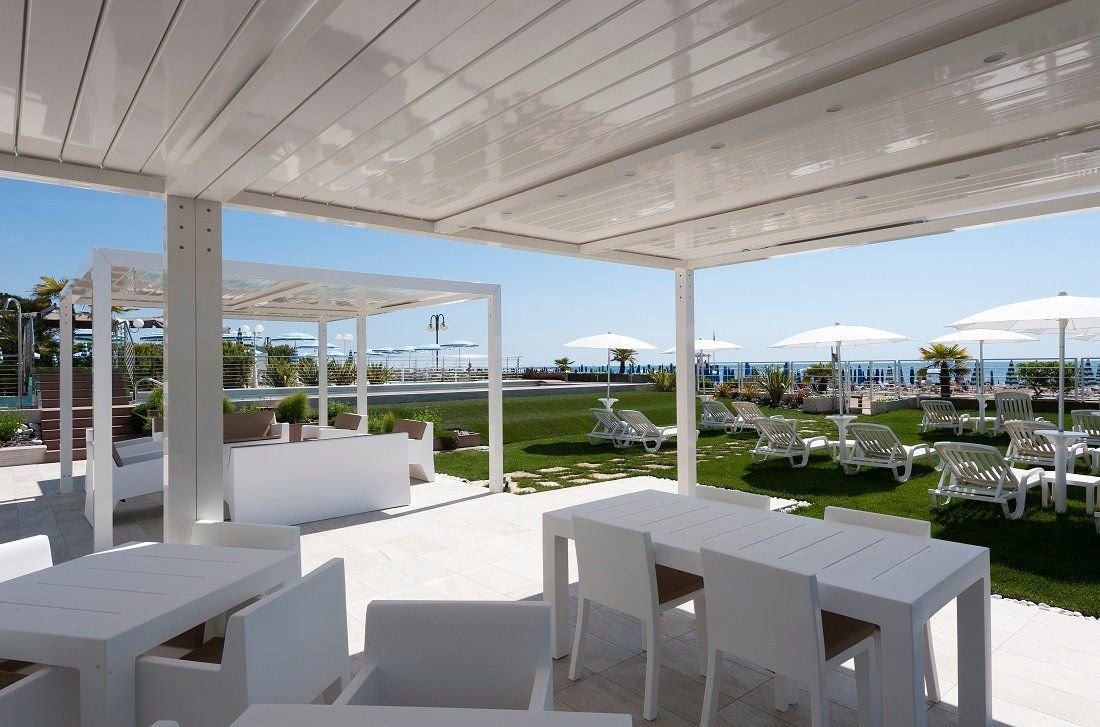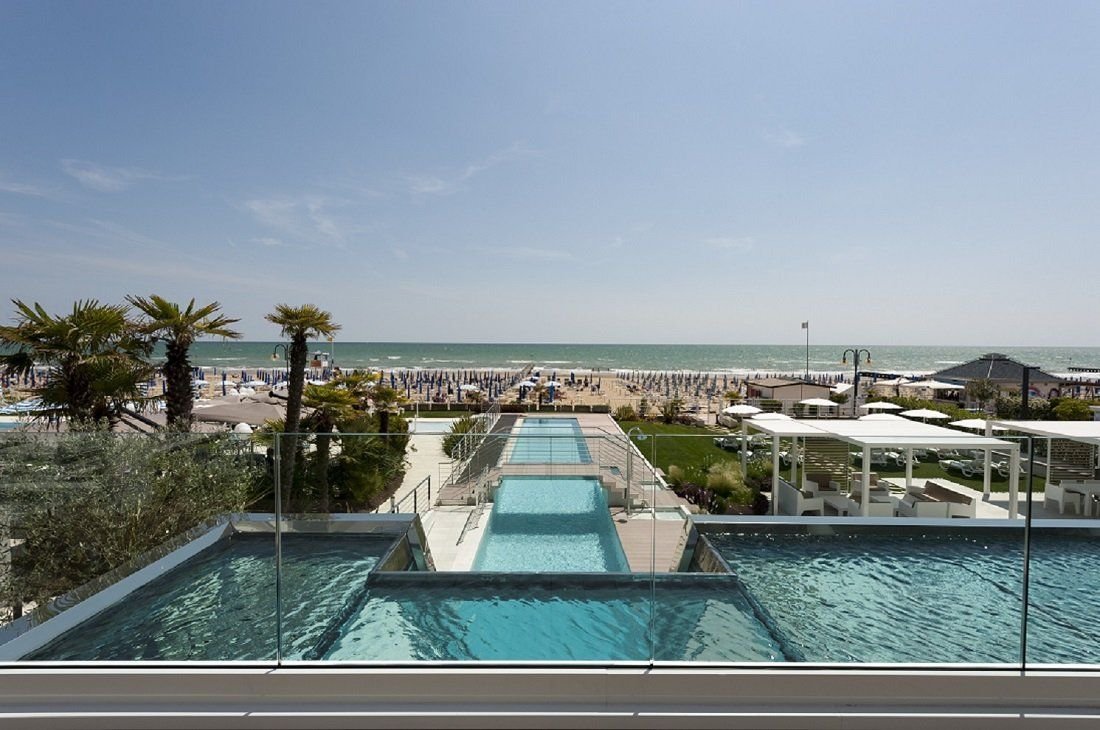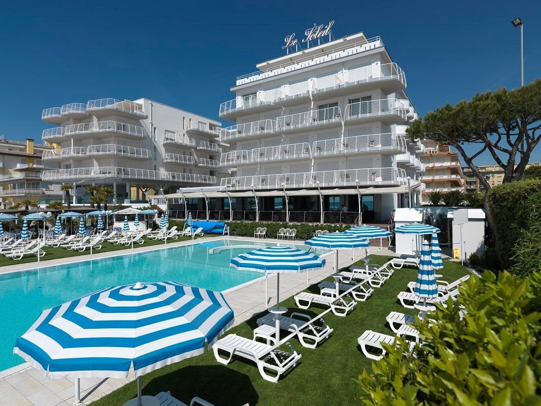 Luxusní hotel s bazénem v západní části letoviska, u náměstí Piazza Aurora. Přímo u pláže, aquapark Caribe bay se nachází cca 1 km od hotelu.