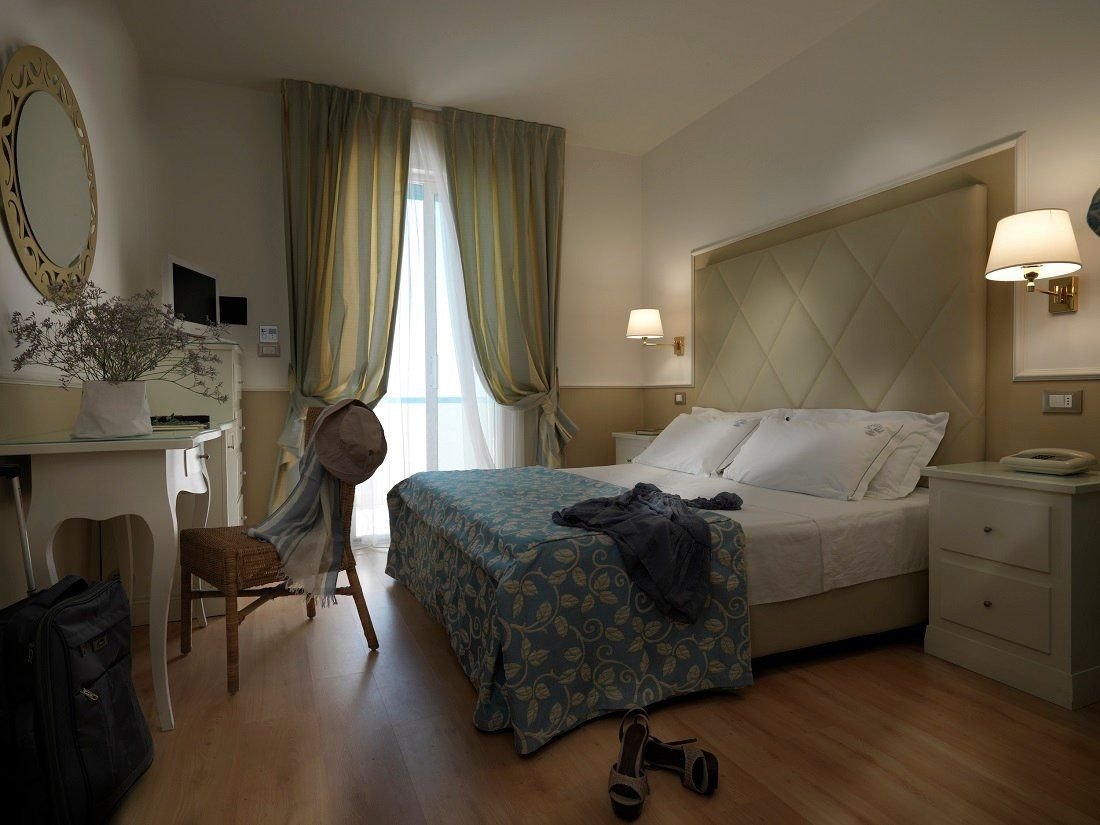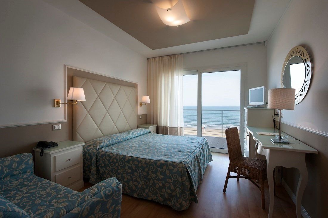 K dispozici celkem 174 komfortně zařízených pokojů vybavených TV, fénem, trezorem, telefonem, minibarem, klimatizací a WiFi.Pokoje Standard pro 2/3 osoby: pokoj s manželským lůžkem nebo 2 lůžky a pohovkou pro 1 osobu, koupelna, balkon.Dvoulůžkový pokoj s výhledem na moře: pokoj s manželským lůžkem nebo 2 lůžky, koupelna, balkon s přímým výhledem na moře.