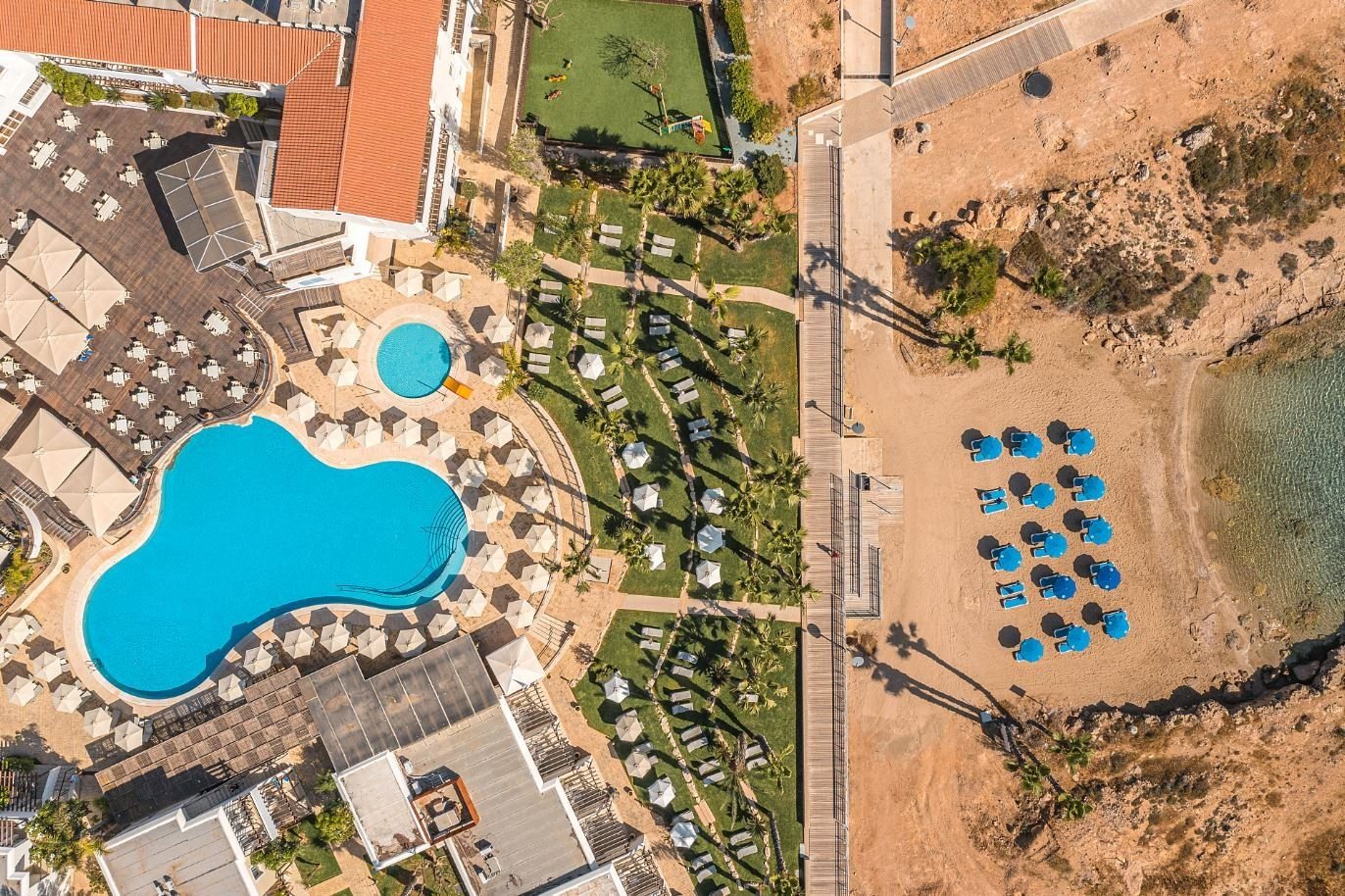 V klidnější lokalitě přímo u pláže. Nejbližší obchody a restaurace cca 500 m od hotelu. Letovisko Protaras cca 3 km o hotelu. Lze jít po promenádě podél pobřeží nebo využít autobus (zastávka bus cca 500 m od hotelu). Autobusem se lze rovněž dostat do Ayia Napa (cca 11 km od hotelu). Letiště v Larnace je vzdáleno cca 65 km.Pláž