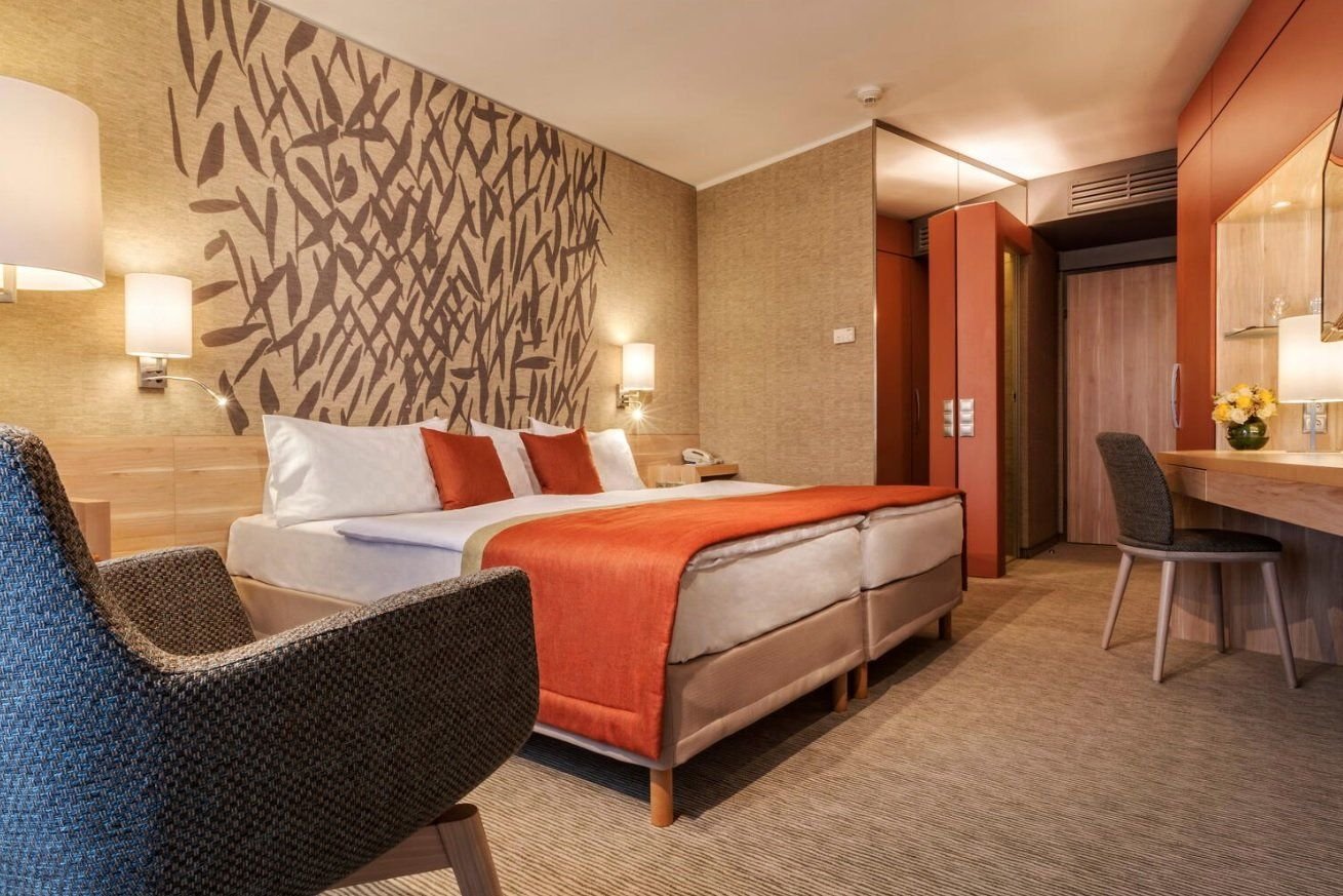 Dvoulůžkové pokoje s možností přistýlky, příslušenství, wifi, minibar, rádio, TV/sat., klimatizace, fén, francouzské okno, župan.