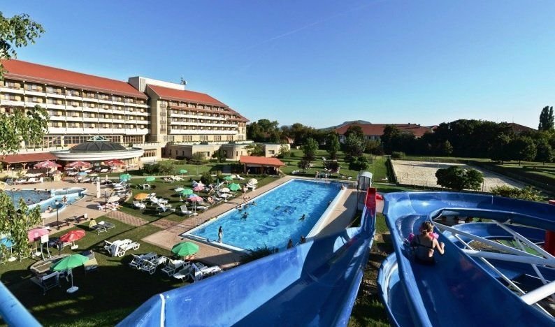 Hotel je situován poblíž centra města, uprostřed parku, přímo nad krasovou jeskyní, jejíž speciální mikroklima vykazuje léčivé účinky. Pouhých 12km od Balatonu.