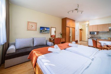 Dvoulůžkové pokoje s možností přistýlky, příslušenství - televize, radio, telefon, balkon. Součástí každého apartmánu je vybavená kuchyň a chladnička.Budova A a B - v omezeném množství apartmány standard plus, za příplatekPři ubytování 3 a více nocí klienti obdrží v recepci vstupenku do lázní. (kromě období svátků). Vstupenku nelze využít v den odjezdu.