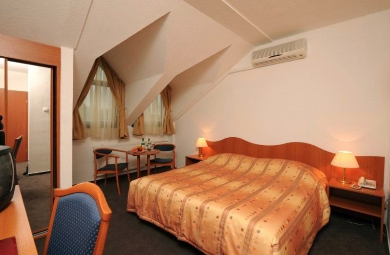Dvoulůžkové pokoje s možností přistýlky, s balkonem, příslušenství, fén, minibar, TV/sat., telefon, WiFi. Jednolůžkové pokoje jsou v podkroví a bez balkonu.