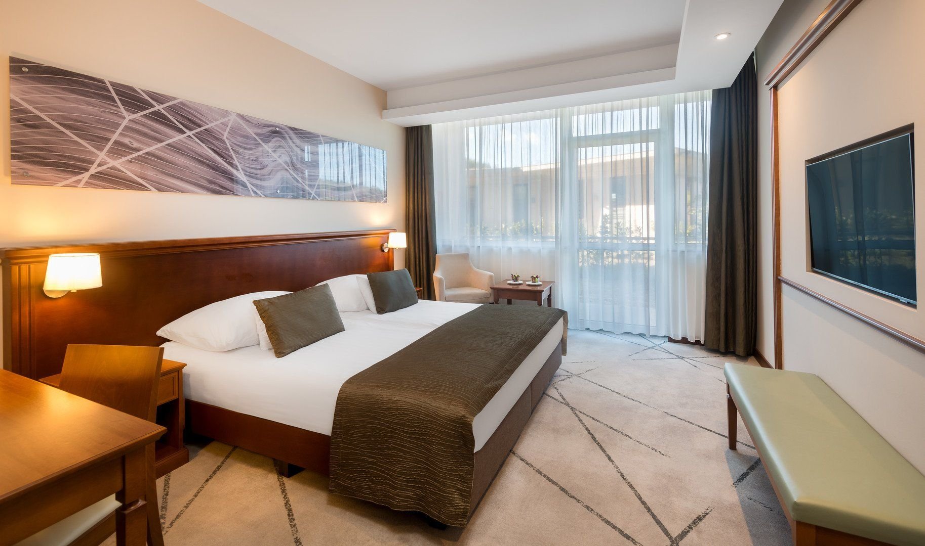 Moderní dvolůžkové pokoje mají vlastní příslušenství (koupelna, WC) a dále jsou vybaveny klimatizací, minibarem, TV/Sat., telefonem, trezorem, Wi-Fi a balkonem, župan.
