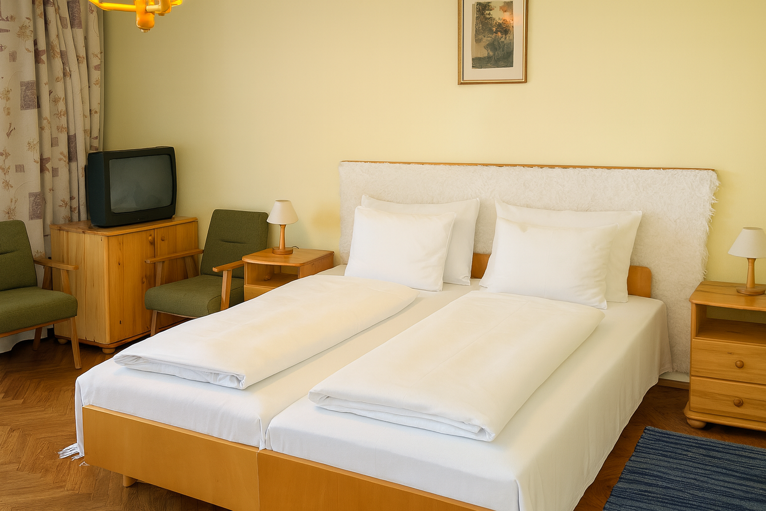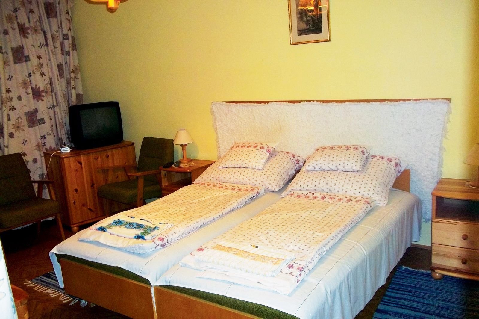 Dvoulůžkové pokoje s možností přistýlky nebo rodinné pokoje pro 4 os. se dvěmi ložnicemi. Všechny rodinné pokoje jsou vybaveny základním příslušenstvím, balkonem, lednicí a TV. Kuchyňský kout se základním vybavením a elektrickým dvouvařičem.Každý byt má jiného majitele, proto je vybavení bytů rozdílné.