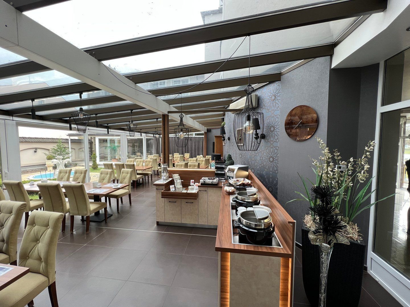 Restaurace Olivia s letní terasou, zahradou.Vstup do wellness je EUR 8,-/ osobu/ den - k dispozici je masážní bazén 32-34 °C, vyhřívaný krytý bazén 7 x 4 metry, finská sauna, zážitková sprcha, solná komora.Parkování u hotelu.