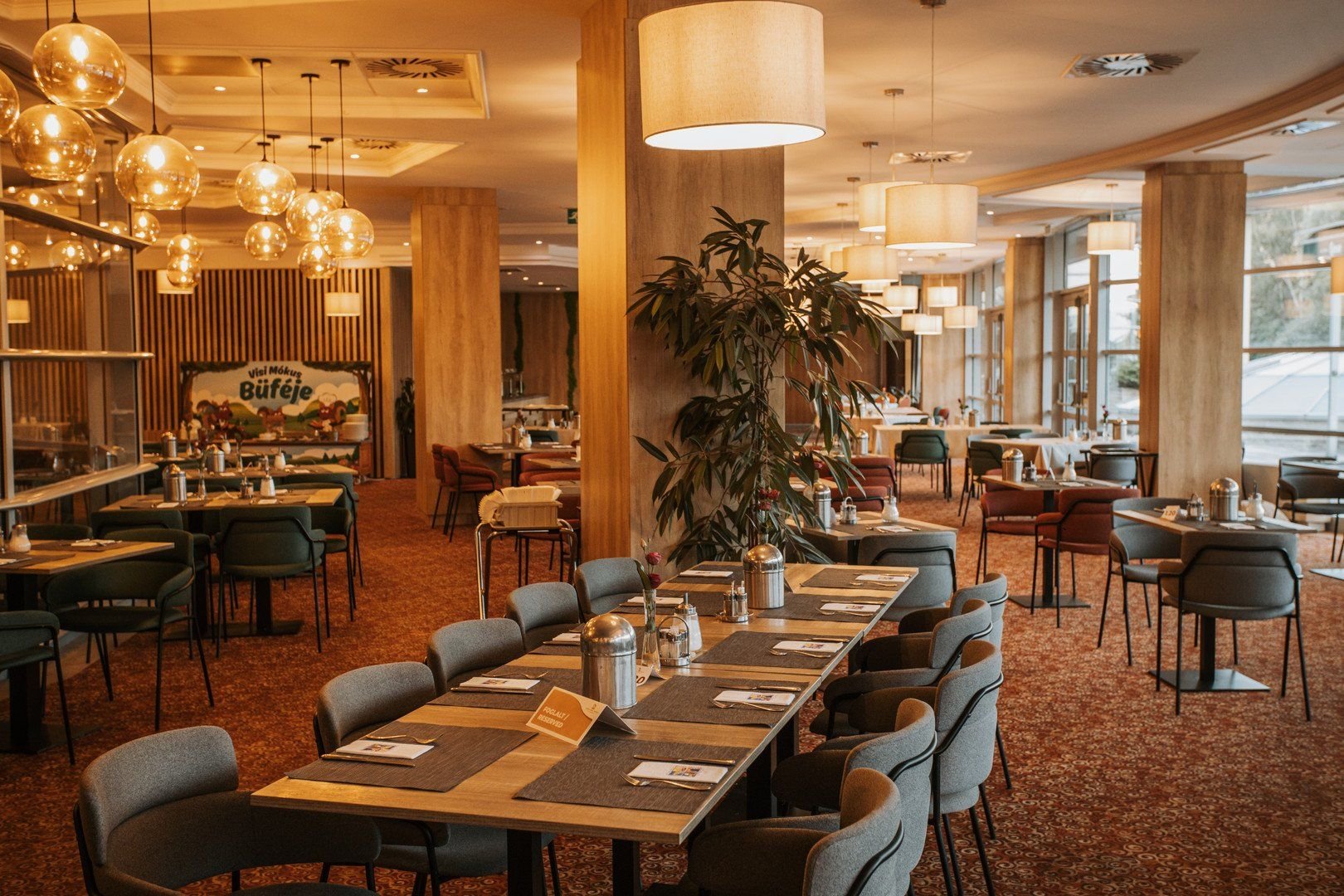 Polopenze. Snídaně a večeře bohatým bufetovým způsobem.Jednou z chloub hotelu je restaurace The Danube s nádherným výhledem na Dunajské ohbí, nabízí tradiční maďarské i mezinárodní pokrmy.